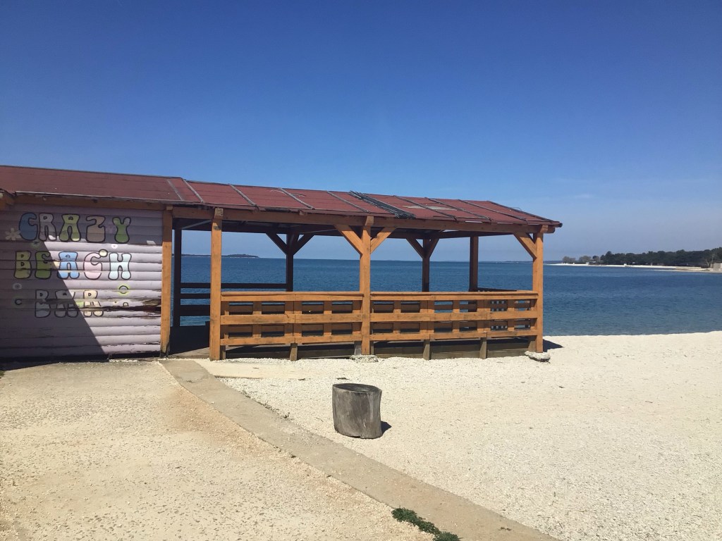 Le paysage me fait penser aux causses avec cette végétation aride parsemée de cultures et de chemins bordées par des murets de pierre. J’aperçois même des bories. Au bout d’un moment, je bifurque à droite en direction de Murage pour redescendre vers la mer et longer la côte. En milieu de matinée, je m’arrête à Fazana pour y prendre mon café. Nous ne sommes que vendredi mais les terrasses sont déjà bien garnies. J’en profite pour écouter un long message vocal de ma puce qui m’apprend, après 3 ans de voyage, que l’on peut s’abonner à ce blog et recevoir une alerte dès qu’un article est prévu.