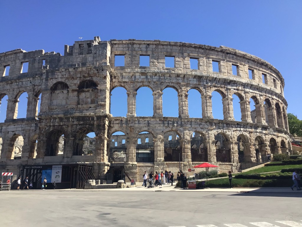 Je me dirige ensuite vers la grosse ville de Pula qui a même son aéroport. Je comprends mieux en rentrant dans le centre ville en découvrant une magnifique arène romaine ainsi que temples et autres vestiges romains. Je déambule dans les rues piétonnes toujours perché sur mon destrier mais en mode tout à gauche. Je mouline pour avancer au pas des piétons. Je préfère cela qu’à le pousser au risque de me prendre des retours de pédale. (Ça fait très mal au tibia !).