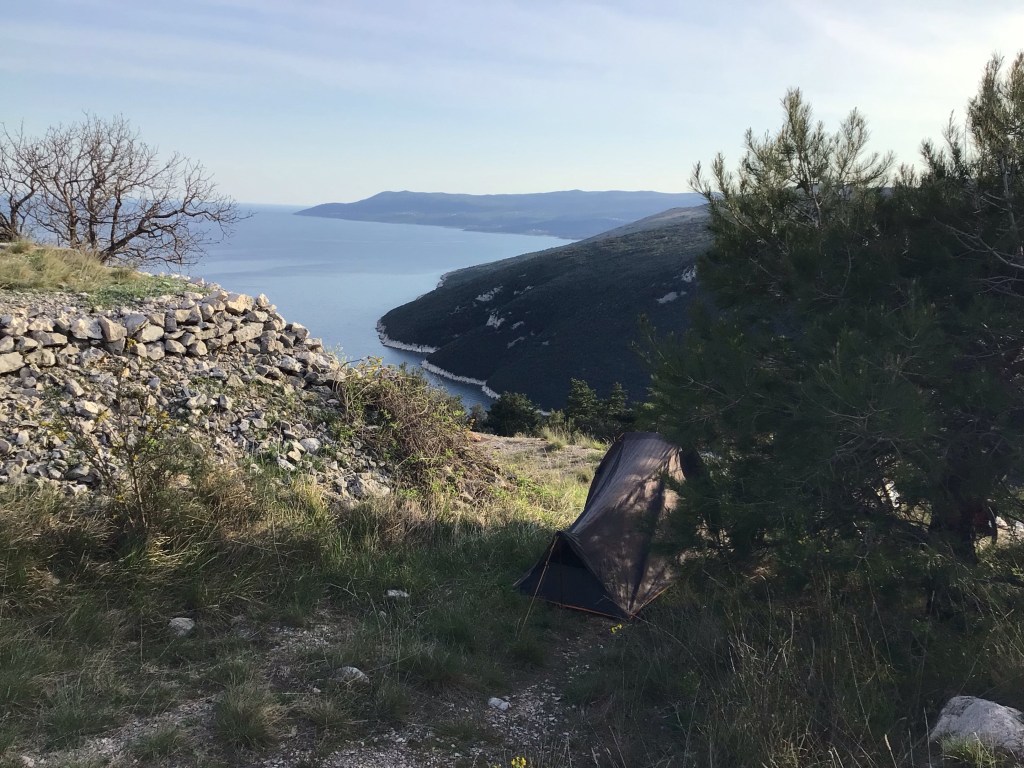 Pour ne pas reproduire le même démarrage que ce matin, je décide d’attaquer ma dernière montée après être descendu à Plomin Luka. Je passe d’ailleurs dans le village que l’on voit perché en haut à gauche avec vue sur le complexe industriel. Je voulais m’arrêter vers 17h comme j’en ai pris l’habitude depuis le départ. Mais cela va être plus tard. J’espère juste trouver un emplacement après le col. Arrivé en haut se trouve un hôtel panoramique pour touristes et motards, très nombreux dans le coin. Je continue et aperçois un mauvais chemin empierré qui grimpe sec sur la gauche de la route. Je l’emprunte non sans mal et finis par trouver mon hôtel 5* avec vue sur mer et sur l’île de Cres. Tout se fera !
