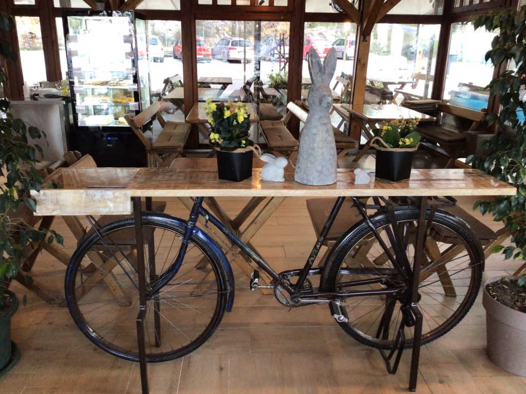 Dans ce café trône un vieux vélo aménagé en comptoir. Cela me donne des idées pour de futures réhabilitations. En effet, je continue à entretenir le parc de vélos de l’Arche ainsi que de redonner vie à de vieux vélos. Depuis la fin de mon dernier périple autour de la péninsule ibérique et de la botte italienne, j’avais terminé mon mécénat de compétence à L’Arche-en-Pays-Toulousain puis rendu mon tablier fin septembre de chez AtoS. Le 1er octobre 2021, j’étais un tout jeune retraité après avoir fêté mes 60 piges le 20 septembre.