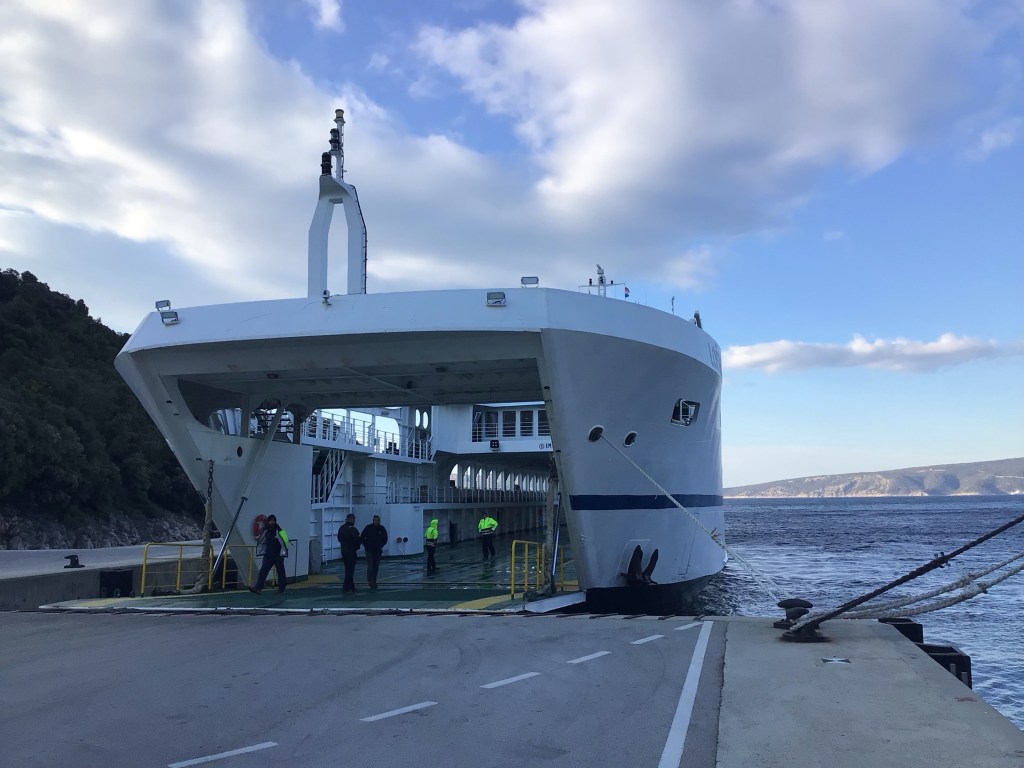 Au lever du jour, le vent s’est remis à souffler fort. Cette fois-ci, je ne me suis pas rendormi. A 7h00, j’avais déjà rangé mon barda et attaqué les 800m de mauvais chemin pour remonter sur la route principale. Puis redescendre au ferry afin d’embarquer à 7h45 en direction de l’île de Rab. Le soleil n’a pas encore percé et le froid pique en ce dimanche matin. J’achète mon ticket et file me boire un café bien chaux accompagné d’un cheese-cake en attendant le départ du ferry.