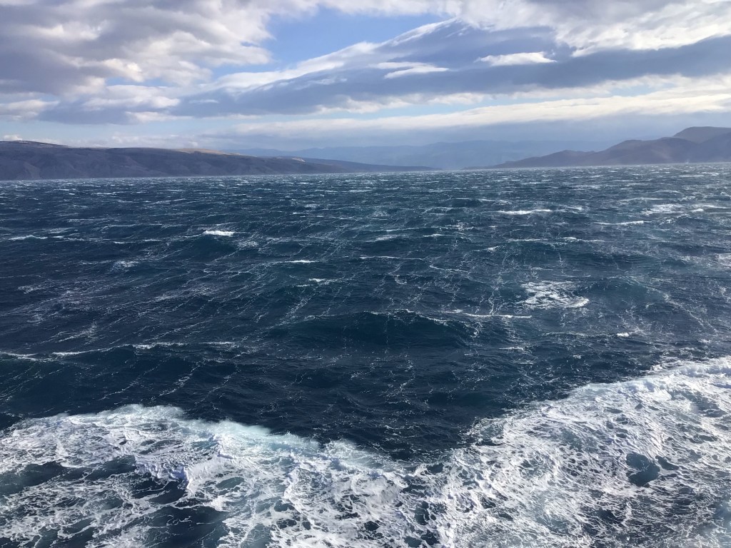 Revenant à nos moutons qui surfent sur les vagues de l’Adriatique. Ça tape sec mais le ferry, dans lequel n’ont embarqué qu’une dizaine de voitures et un couple de randonneurs, trace sa route vers Lopar sur l’île de Rab. Je tente une sortie pour prendre une photo de l’extérieur mais ça souffle vraiment très fort. Je n’aimerais pas être ni sur un voilier, ni sur un bateau de pêche par ce temps.