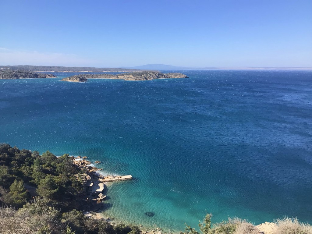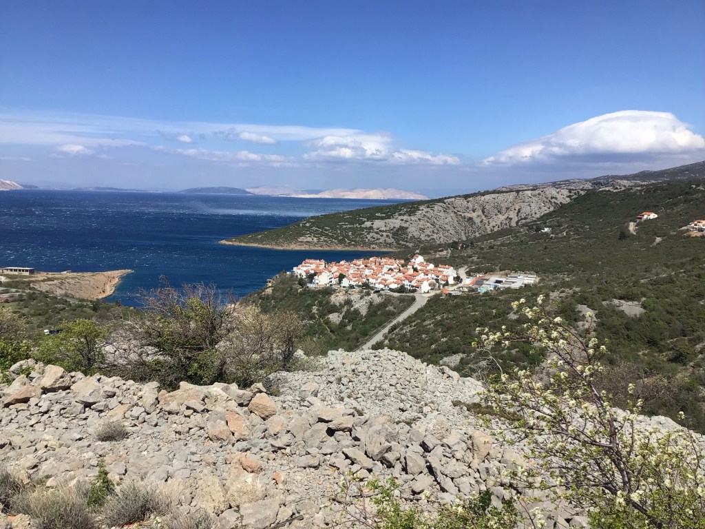 Je traverse cette île d’une vingtaine de kms en suivant l’unique route pour me rendre à Misnjak et prendre un nouveau ferry vers Jablanac et le continent. En débarquant dans le mistral, cela m’y fait penser vu que c’est vent glacial qui vient du nord, j’aperçois l’île de Crès et au loin Krk.