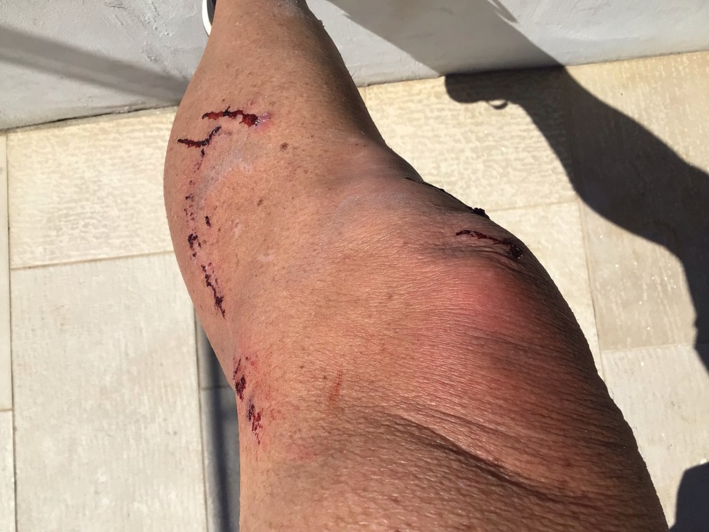J’ai trouvé une chambre dans le village. Je vais pouvoir prendre une bonne douche et soigner mes égratignures. Je sors donc du restau. Je prends des petites rues abritées du vent puis rejoins la route en front de mer qui tourne à angle gauche (?) devant une églisette (petite église) avant de prendre une rue sur la gauche pour trouver la maison à 500m. Et là, je me prends une méchante rafale qui me couche littéralement sur la route !!! Heureusement, la voiture derrière moi m’évite et s’arrête pour prendre des nouvelles. Tout va bien, je vais bien … sauf le coude droit qui a tapé mais rien de cassé. C’est vraiment hallucinant. Je finis en poussant mon vélo.