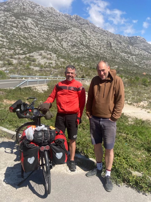 Ça souffle tellement fort que je décide de descendre sur la côte à Prizna et de prendre le ferry pour aller sur l’île de Pag en espérant que le vent sera moins impétueux. Après une longue descente de 3 kms bien pendue et ventue, j’arrive à destination. Mauvaise pioche. Le ferry est à l’arrêt à cause de la tempête. Et les rares magasins sont fermés. Il commence à faire faim avec mon seul cheese-cake et une barre de céréales dans le ventre. Je ne sais pas trop si je prends le risque d’attendre la remise en service du ferry ou celui de remonter la côte en plein zef ? Je suis dans l’impasse. Mais, comme souvent, tout se fera. En effet, un homme arrive et me demande en anglais si je suis au courant pour le ferry. A son accent, je reconnais un concitoyen; je dirais même un briochin.