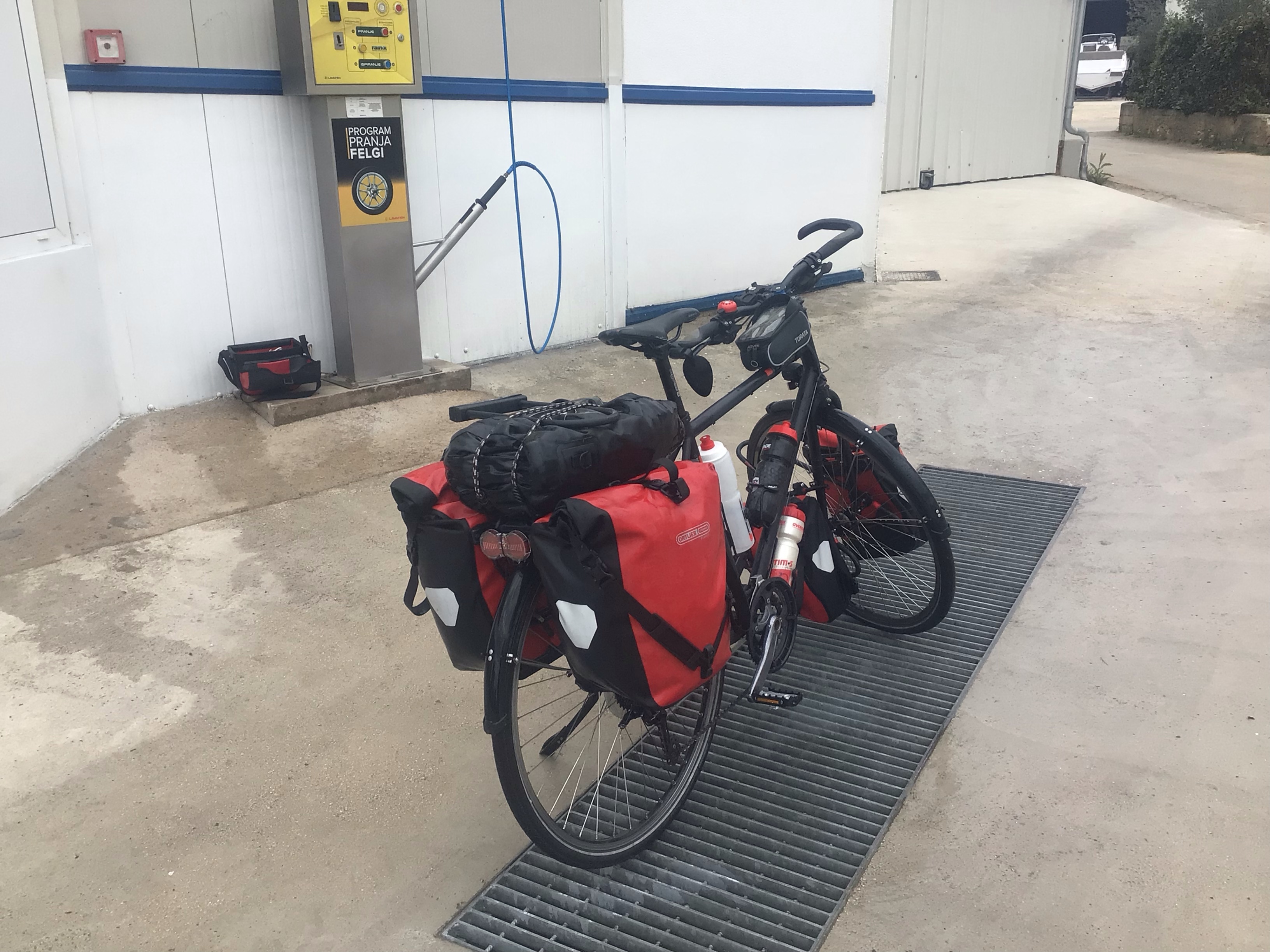 Alors que je traverse une de ces stations balnéaires, je tombe sur une station de lavage. Je vais en profiter pour passer un coup de jet à mon destrier recouvert de sel suite aux traversées mouvementées sur les ferries. La jeune gérante de cette station me laisse le jet gratuitement alors qu’elle finissait de nettoyer mon aire de lavage. Sympa. Mon destrier frétille de contentement entre ses pédales neuves et sa belle robe noire retrouvée.
