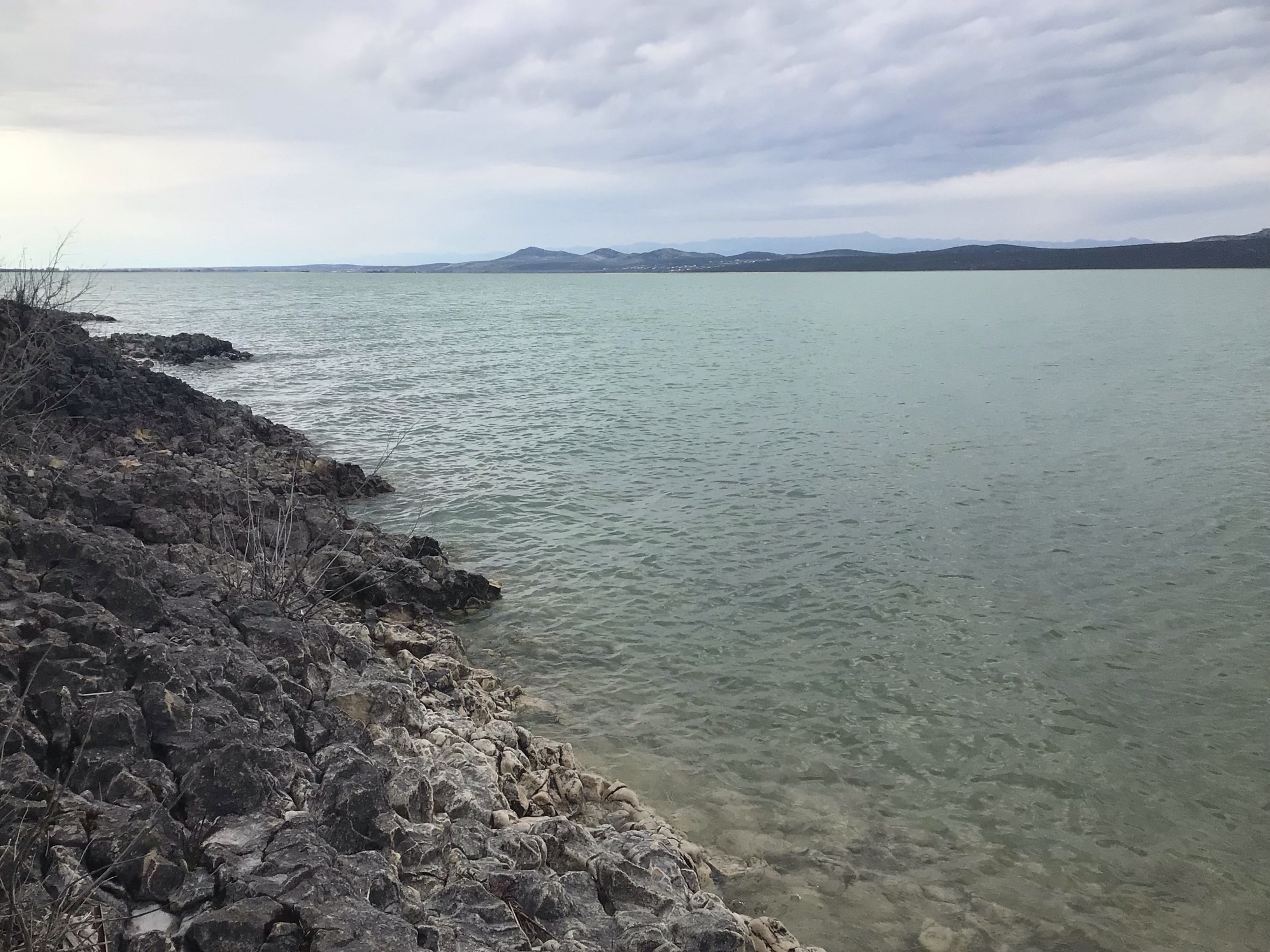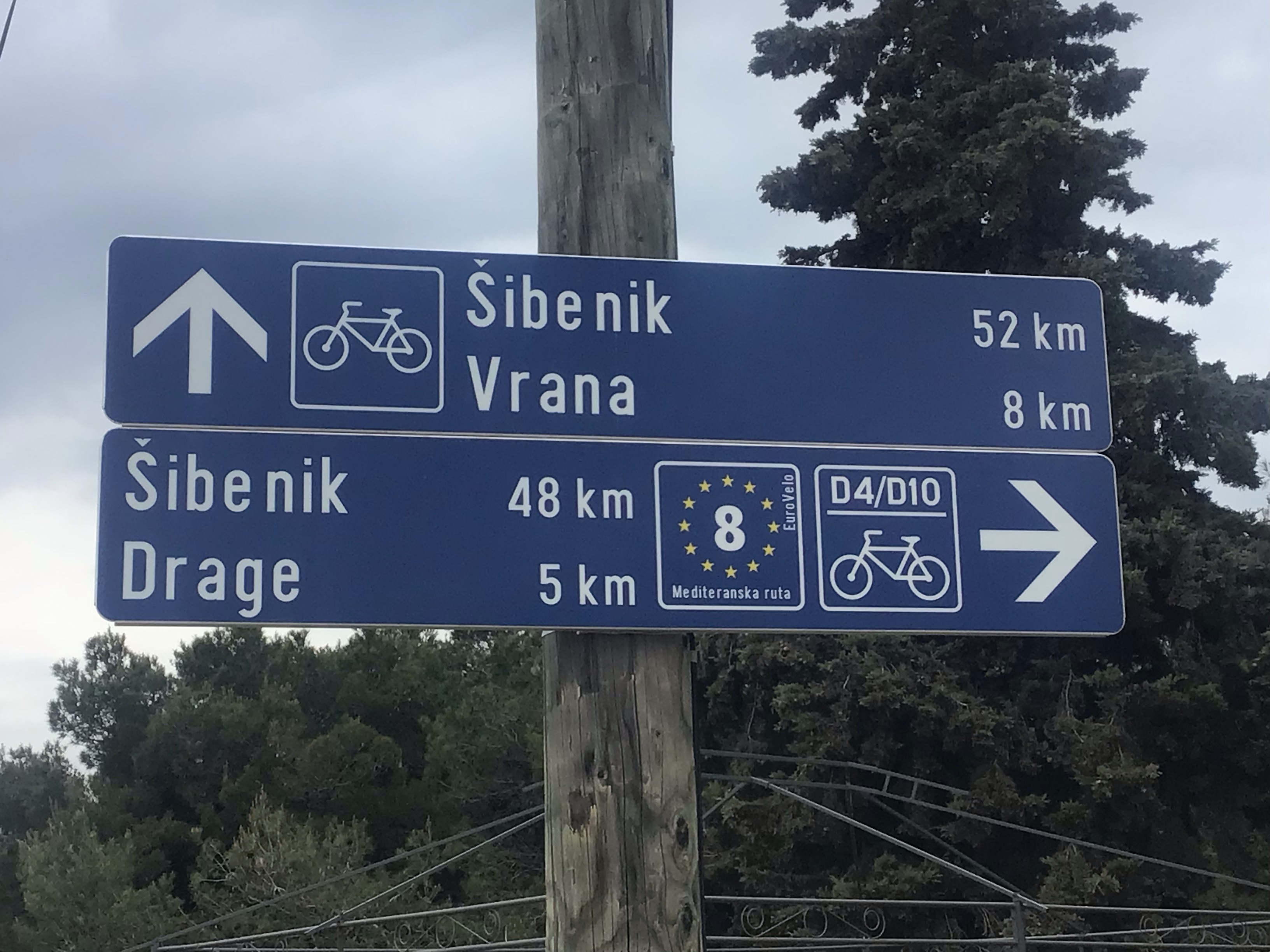 A Pakostane, alors que j’ai retrouvé l’itinéraire EV8, il me faut choisir entre l’itinéraire à l’ouest du grand lac intérieur Vrana ou celui à l’est. Je pars pour l’est et me retrouve sur une charmante route qui serpente dans un parc national avec de nombreuses parcelles donnant sur le lac. L’heure avançant, je sors mes antennes pour dénicher un coin où bivouaquer.