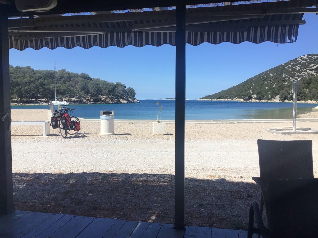 L’EV8 emprunte le même parcours que j’avais tracé la veille en évitant au maximum la route 8 et en suivant au plus près la côte. Le paysage est verdoyant et parsemé d’oliveraies, de vignes et de pins méditerranéens. Les rares villages traversés sont toujours aussi déserts. Au large la côte, j’aperçois toujours autant d’îles et d’îlets.