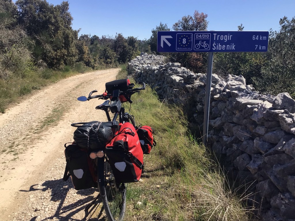 Je poursuis mon petit bonhomme de chemin en direction de Trogir via Sibenik toujours en suivant l’EV8 … sur des chemins de traverse justement ! Mais je préfère cela aux routes où la circulation est trop dense. J’ai hésité à aller jusqu’à Jadrija à la pointe de cette péninsule où il y a un départ de traversier pour rejoindre Sibenik. Une fois à Sibenik, je verrais ce traversier arriver et décharger uniquement des piétons. J’ai bien fait de suivre l’EV8 !