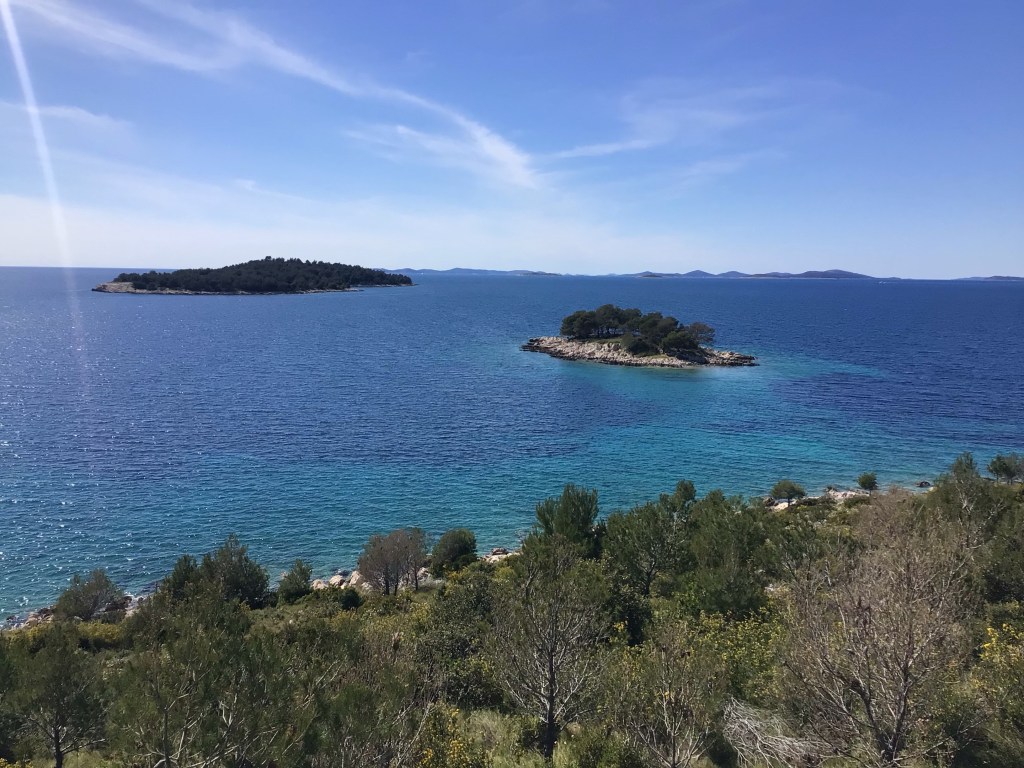 En milieu de matinée, je m’arrête dans le village portuaire de Tribunj où je prends mon café en terrasse avec vue superbe sur des îlets au loin. On se croirait aux Antilles si ce n’est ce vent toujours aussi froid.