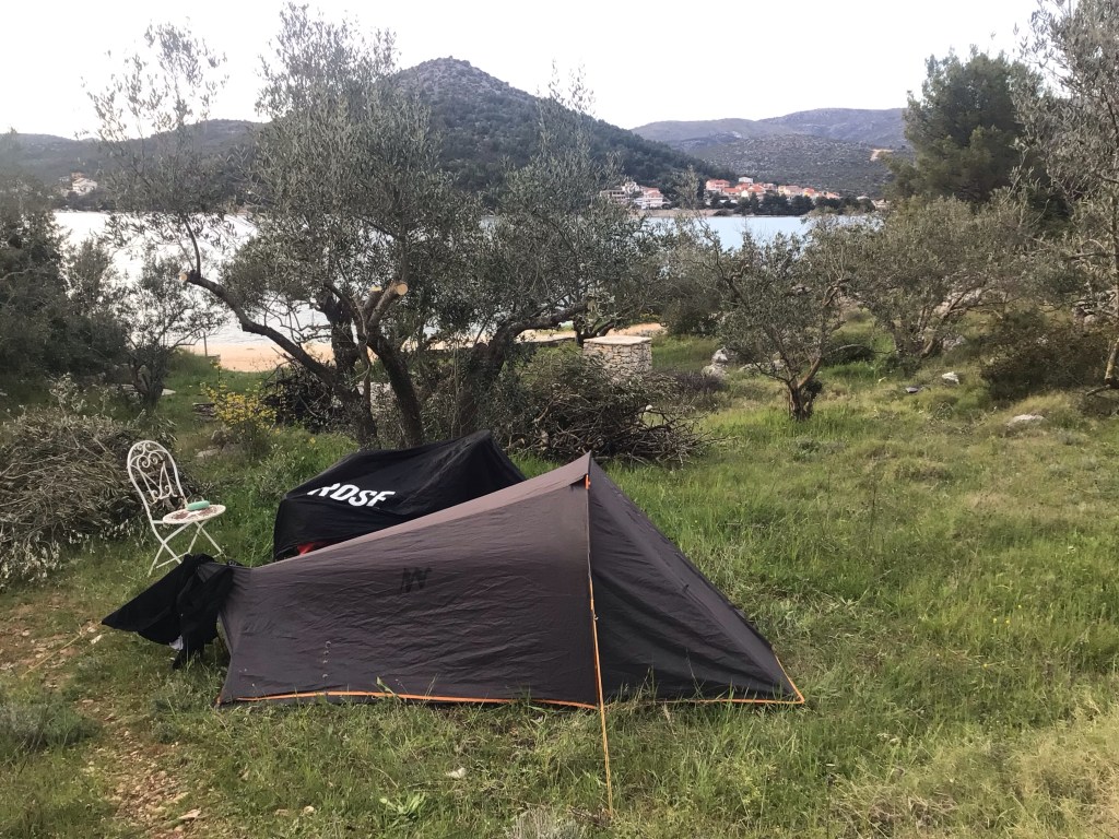 Après Céline, la route 8 coupe à travers la péninsule pour arriver à Marina. Il n’est pas loin de 17h00, je décide de bifurquer ici et d’essayer de trouver un bivouac plutôt que de continuer en bord de route jusqu’à Trogir. J’emprunte un chemin après le port de plaisance qui me mène à un cul-de-sac et au refus d’un propriétaire. Demi-tour, je m’arrêterai un peu plus bas dans une oliveraie. Fin de cette superbe journée bien ensoleillée qui avait pourtant débuté dans le froid et le vent. D’ailleurs, il neige à Montréal !