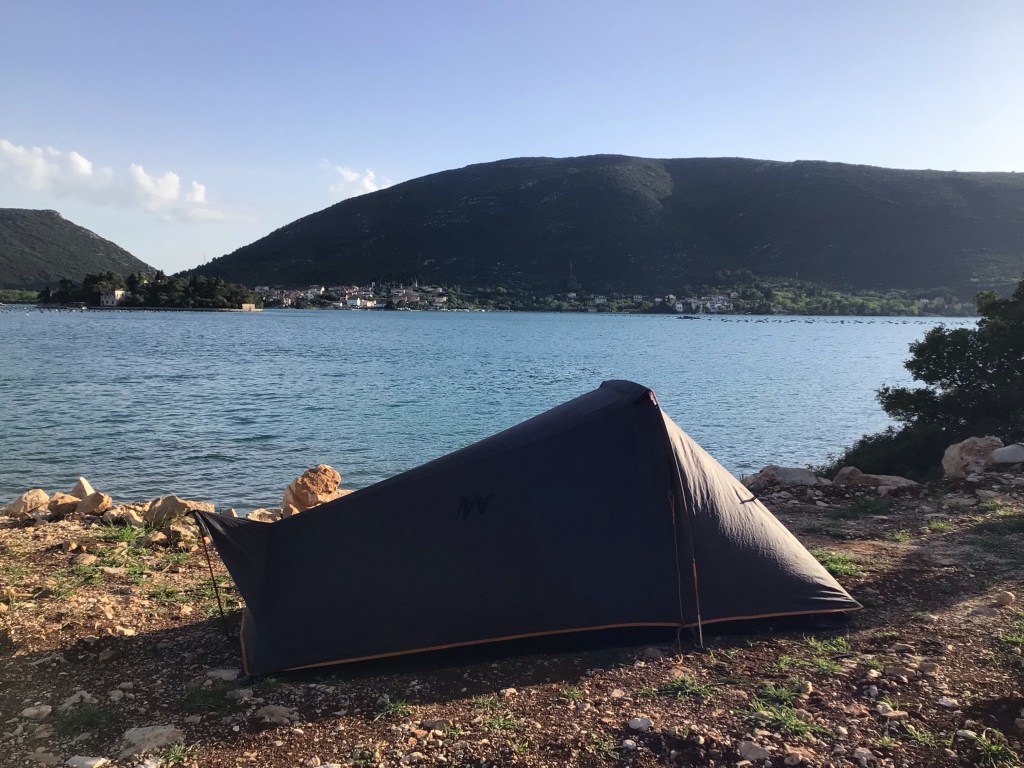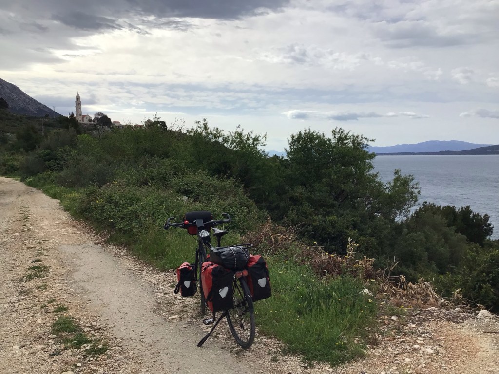Je me fade la remontée vent dans le nez et arrive en haut sous les encouragements et applaudissements de jeunes à la terrasse d’un hôtel. Ce n’est pas non plus la côte de la Redoute et l’arrivée de Liège-Bastogne-Liège mais cela fait plaisir. Puis je reprends la route M-2 bosniaque et traverse à nouveau la frontière méchamment accueilli par la cerbère de service. Il est plus de 17h et il me faut trouver un emplacement. Après un parking où se trouve des stèles commémoratives, j’aperçois un chemin qui descend vers la mer. Il y a une terrasse à l’abri du vent avec vue sur un îlot fortifié et le village de Hodilje. Ce sera parfait pour ce soir après cette longue mais superbe journée de cyclotourisme.