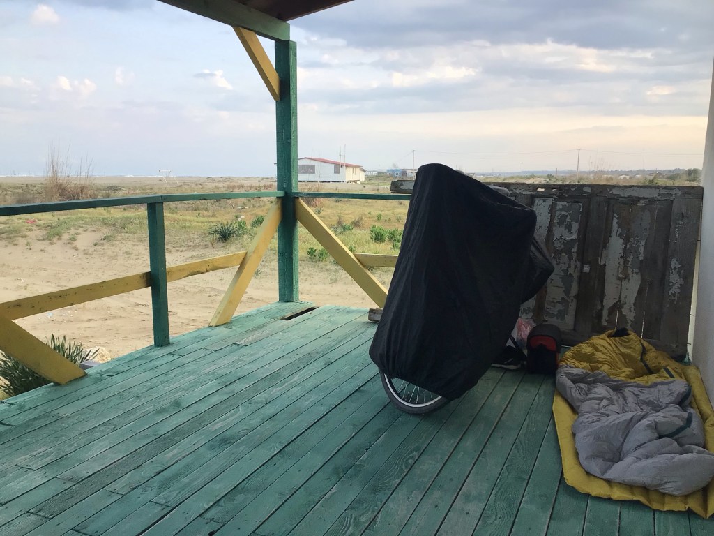 Arrivé à Palasë, je m’arrête faire des courses pour ce soir. Puis je vais à la boulangerie-pâtisserie à côté prendre du pain et un gâteau-récompense. A une table, j’entends parler français. Je les interpelle. Ce sont 2 couples d’une vingtaine d’années. L’un est en camion aménagé. Elle est belge et lui parisien. L’autre couple, elle vendéenne, lui rennais est en vadrouille en stop et bus. Ils se sont croisés il y a 2 jours, ont sympathisé et font désormais route commune en remontant vers le nord. On discute un long moment mais, l’heure avance, et il me faut trouver trouver où dormir ce soir. Et au sec si possible, vu que mes petits français m’ont annoncé de gros orages pour la nuit …