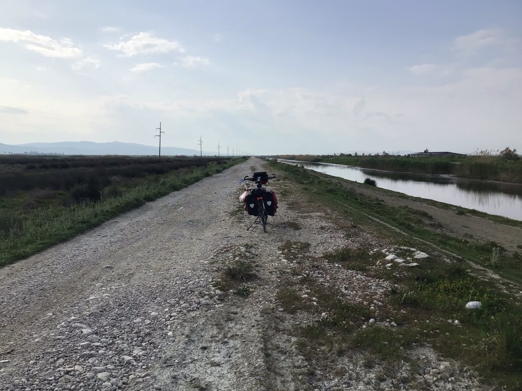 Je reprends la route qui longe la lagune. Alors que j’arrive au bout de cette lagune, je continue sur la route SH8 qui est un immense chantier avec un élargissement de voies en perspective. C’est un sacré boxon. Heureusement que nous sommes dimanche et qu’il n’y a ni bus, ni camion. Puis je passe à Tragjas en fond plat montant. Je croise un couple de cyclotouristes. Je les salue. Le gars me lance un sonore « Good luck ! ». Le ciel est sombre à l’horizon. Je vois une vallée au fond. Je pense passer par là.