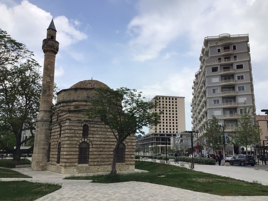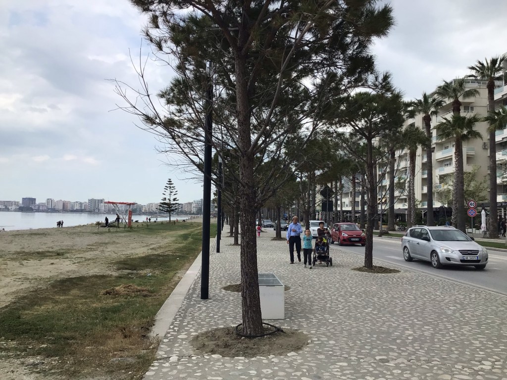 Le décor change complètement. Après la grande plaine, je me retrouve en front de mer avec la route SH8 qui devient beaucoup plus escarpée. J’arrive à Vlorë grande ville portuaire d’où un ferry part pour Brindisi dans les Pouilles. Et dire qu’il y a un peu plus d’un an, j’étais juste en face … En ce dimanche matin, tous les albanais semblent de sortie. Les lavazh, magasins, commerces, cafés et restaus sont tous ouverts. Pas de muguet non plus à l’horizon. Le 1er mai, ils s’en tamponnent le coquillard ici ! Mais toujours cet antagonisme entre passé et présent.