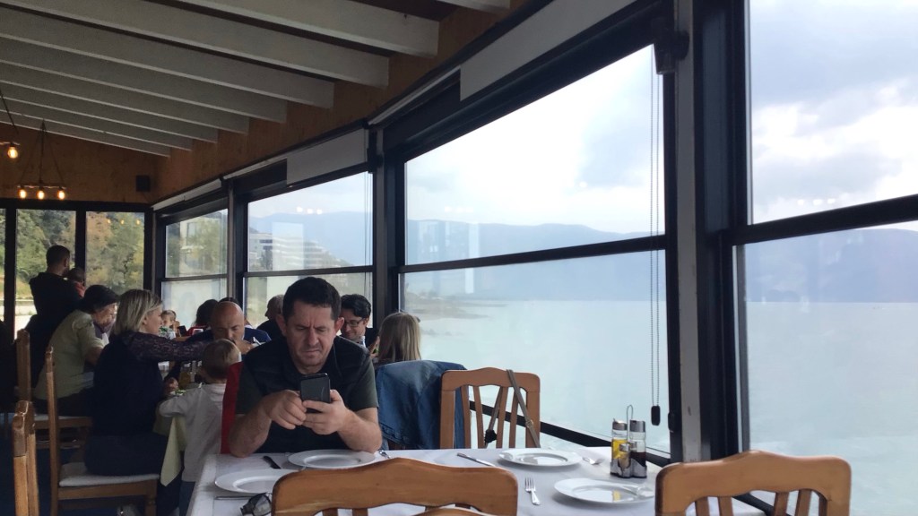 De mon côté, je m’éloigne de la ville pour trouver mon bonheur dans un restau les pieds dans l’eau, spécialisé en fruits de mer et poissons. Je suis un des premiers arrivés. Lorsque je repars, il est blindé. En ce dimanche férié, je me tape la cloche : salade mixte, liguine aux fruits de mer, pâtisserie, bière et café.