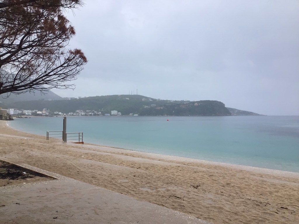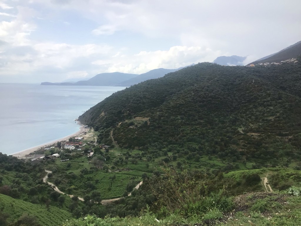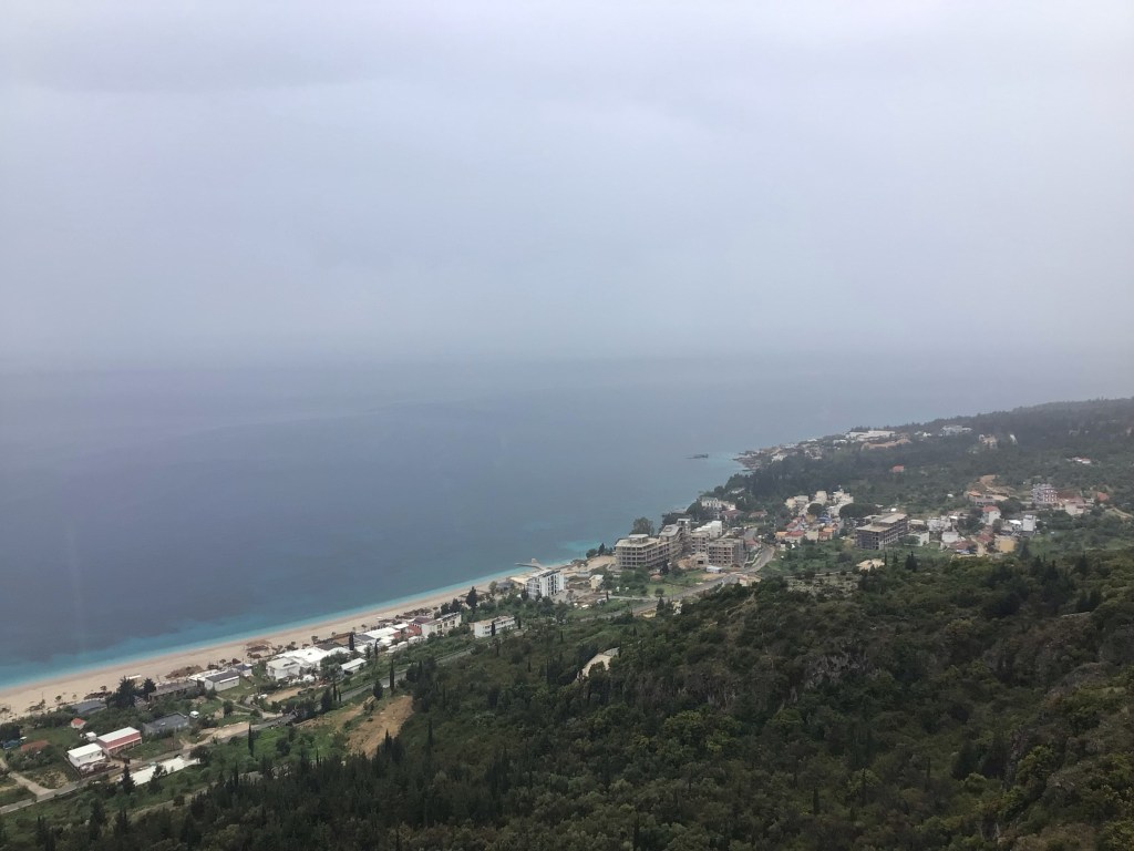 Une fois le col franchi, je descends les mains sur les freins jusqu’à Himarë en bord de mer pour me réchauffer et boire mon café. La pente est raide, limitée par endroit à 20km/h et détrempée. Je fais hyper gaffe. D’ailleurs, il va falloir que je pense à changer les patins, sans parler de la chaîne et de la K7 voire les pneus ! Par contre, l’addition me semble un peu corsée pour un café américano. J’ai l’impression que les prix, comme les routes ici, grimpe en se rapprochant de la Grèce.