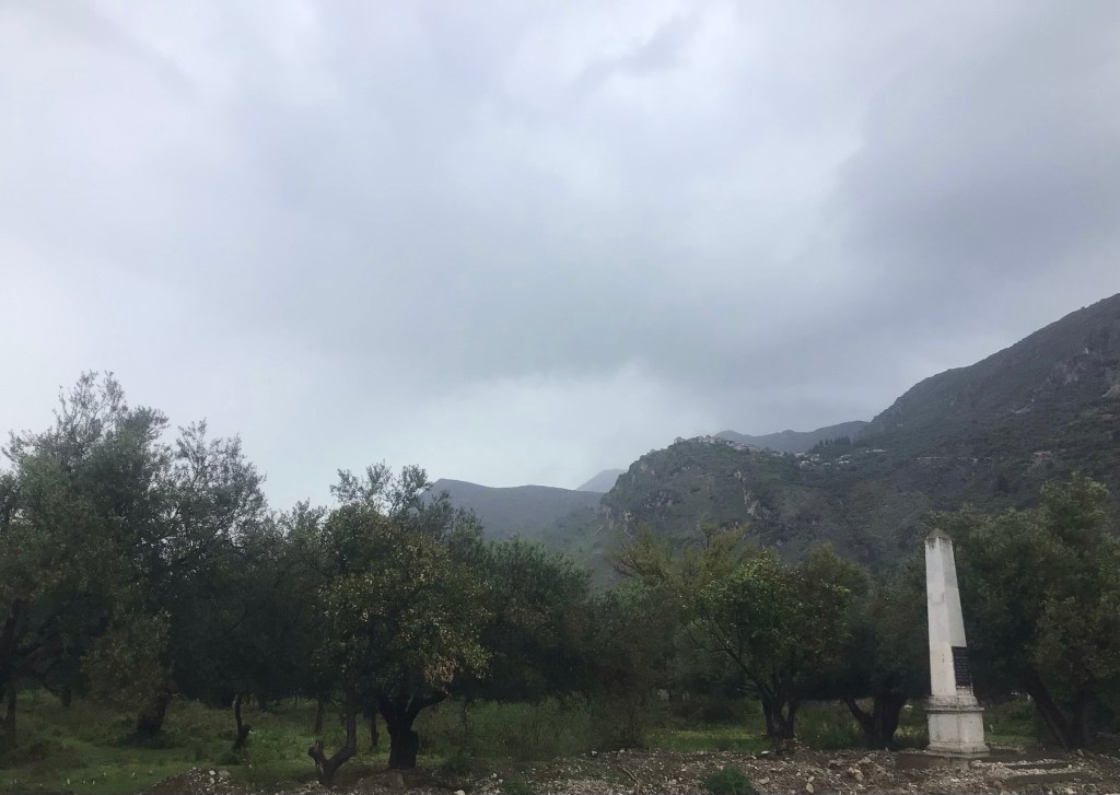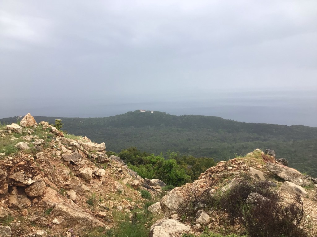 C’est dommage. Le paysage est sauvage et superbe. Sous la pluie, les senteurs de romarin et de thym exhalent. A un moment, je retrouve des paysages de terre rouge comme autour du lac du Salagou dans l’Hérault. Alors que je suis sur un faux-plat, je croise un cyclotouriste bien couvert. On s’arrête et discute. C’est un belge de Gand qui est parti d’Allemagne, a traversé le continent jusqu’en Grèce avant de remonter chez lui. Il circule sur un vélo électrique le veinard. On se souhaite bonne route et ça repart sous le déluge.