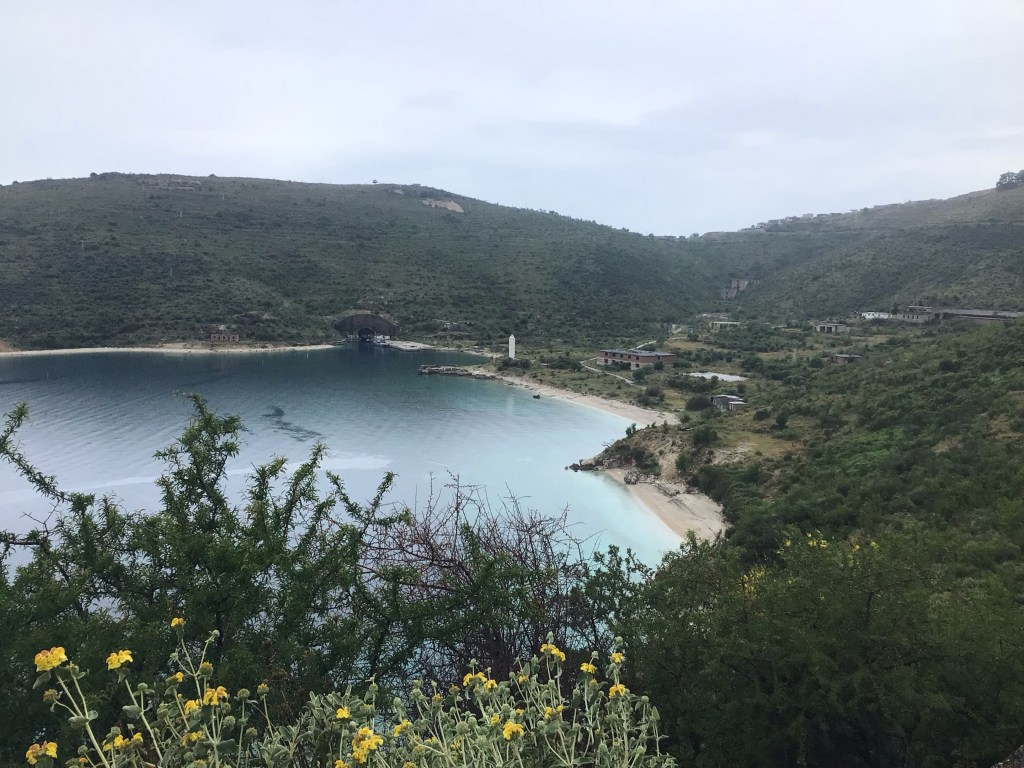Les montagnes russes se poursuivent. Je monte tout à gauche. Je descends tout à droite. Je prends cher par en haut. C’est vraiment la plus belle partie de l’Albanie de ce que j’ai parcouru. Dommage que la météo ne soit pas terrible … En longeant la côte, derrière une crique au sable fin pas encore investie par les hôtels, je repère au loin un abri de navires militaires.