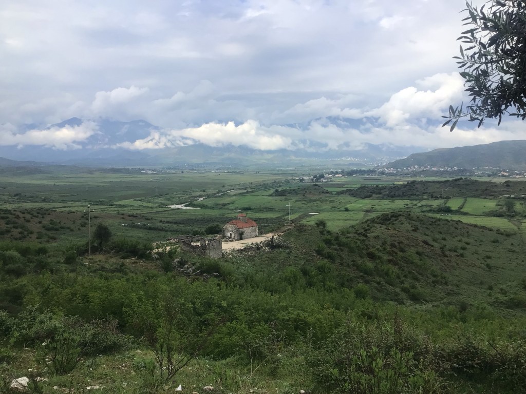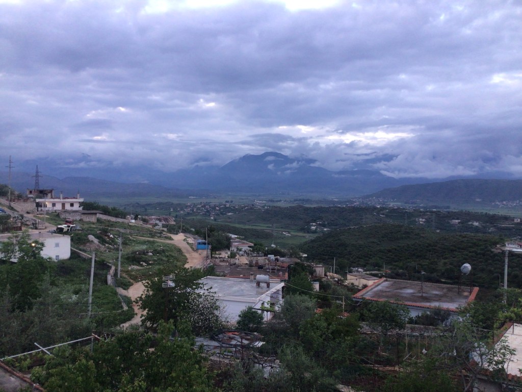 Je trouve enfin la maison « Eglent Tourist House ». Tous les volets sont fermés. J’espère que le portail, lui, est ouvert et qu’il y a bien quelqu’un. C’est ouvert. Je rentre. Frappe à la porte. Attends. Une vieille dame m’ouvre et me baragouine en albanais que je ne maitrise toujours pas bien. Puis elle part derrière la maison et revient avec son petit-fils qui, lui, parle anglais. Ouf ! Tous les deux sont d’une gentillesse extrême comme la plupart des albanais croisés. Elle m’offre même une bouteille d’eau minérale. Il est 19h30. Je peux enfin me poser après cette rude journée. Je mets mes affaires à sécher sur le balconnet. La vue y est splendide.