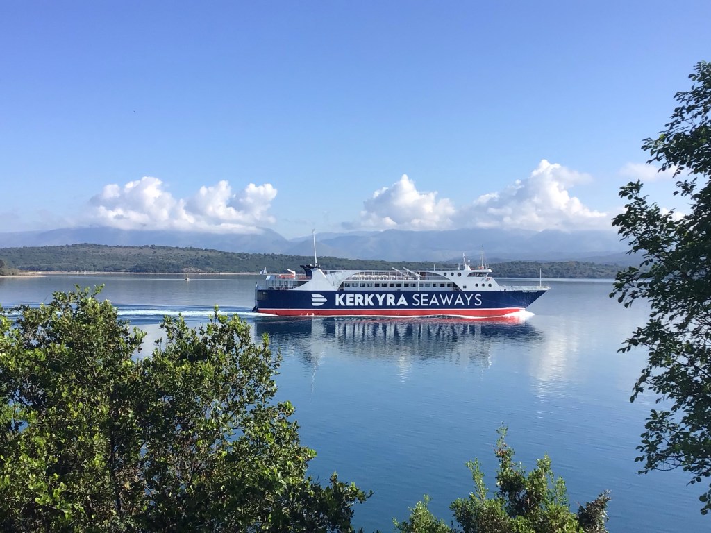 Alors que je quitte la baie, un bateau en provenance de Corfou y entre. J’aurais pu être dedans. En effet, c’était l’option 3 si je n’avais trouvé de magasin (ou de chaîne) ni à Sarandë, ni à Corfou; j’aurais alors pris le ferry pour me rendre direct à Igoumenitsa.