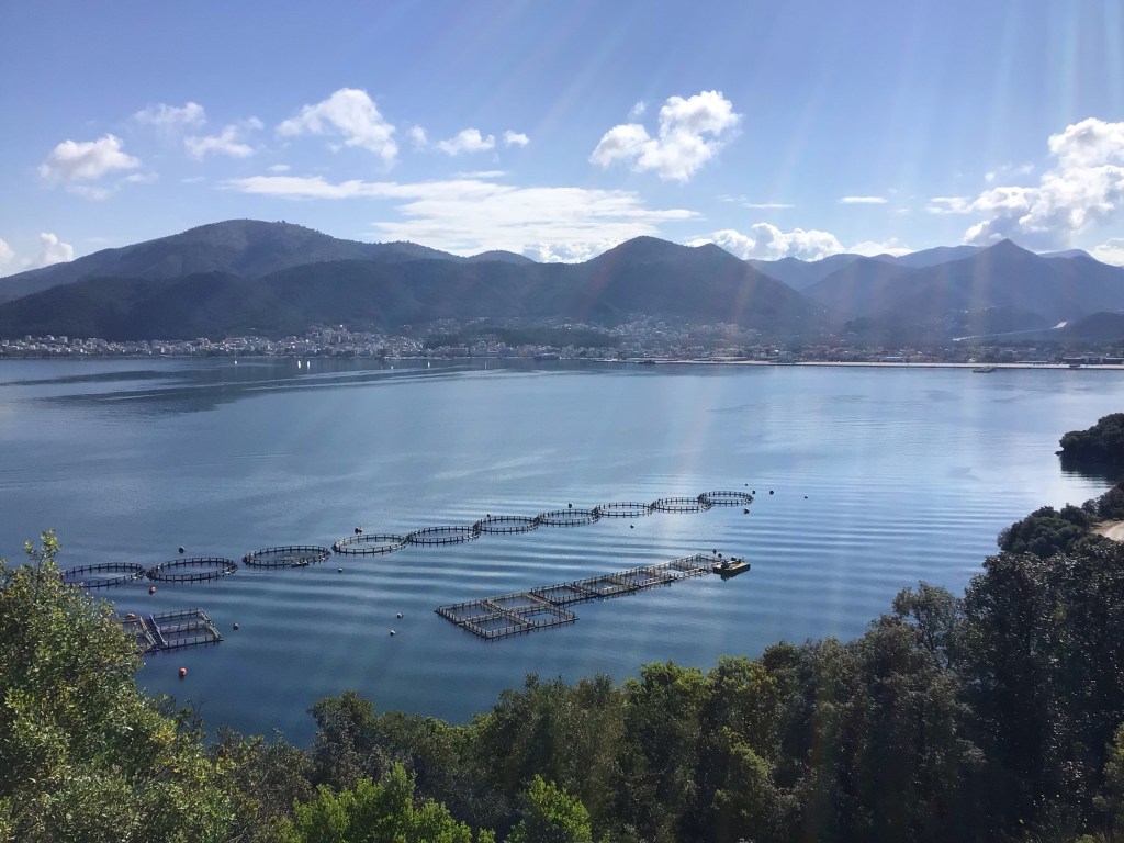 J’arrive ensuite dans la baie d’Ammoudia où se jette le fleuve Acheron. Je m’arrête au-dessus de cette baie à Mesopotamo pour y déjeuner. Je trouve une boulangerie-pâtisserie où je m’installe en terrasse pour y déguster deux chaussons (confortables) : un fourré à la fêta, l’autre à la crème vanille.