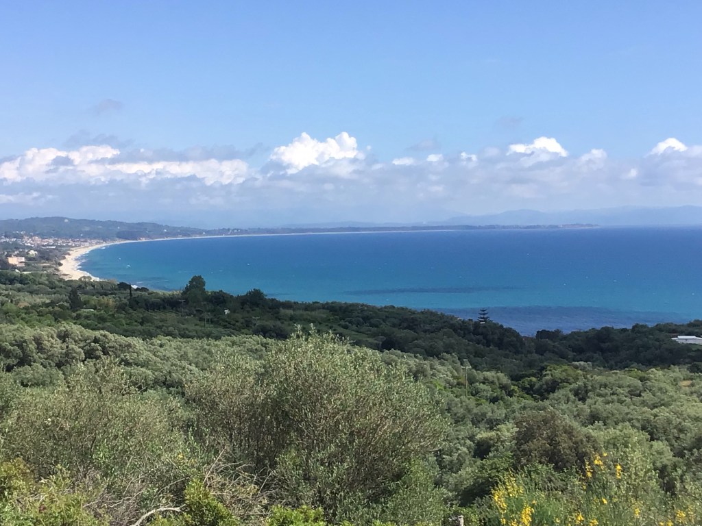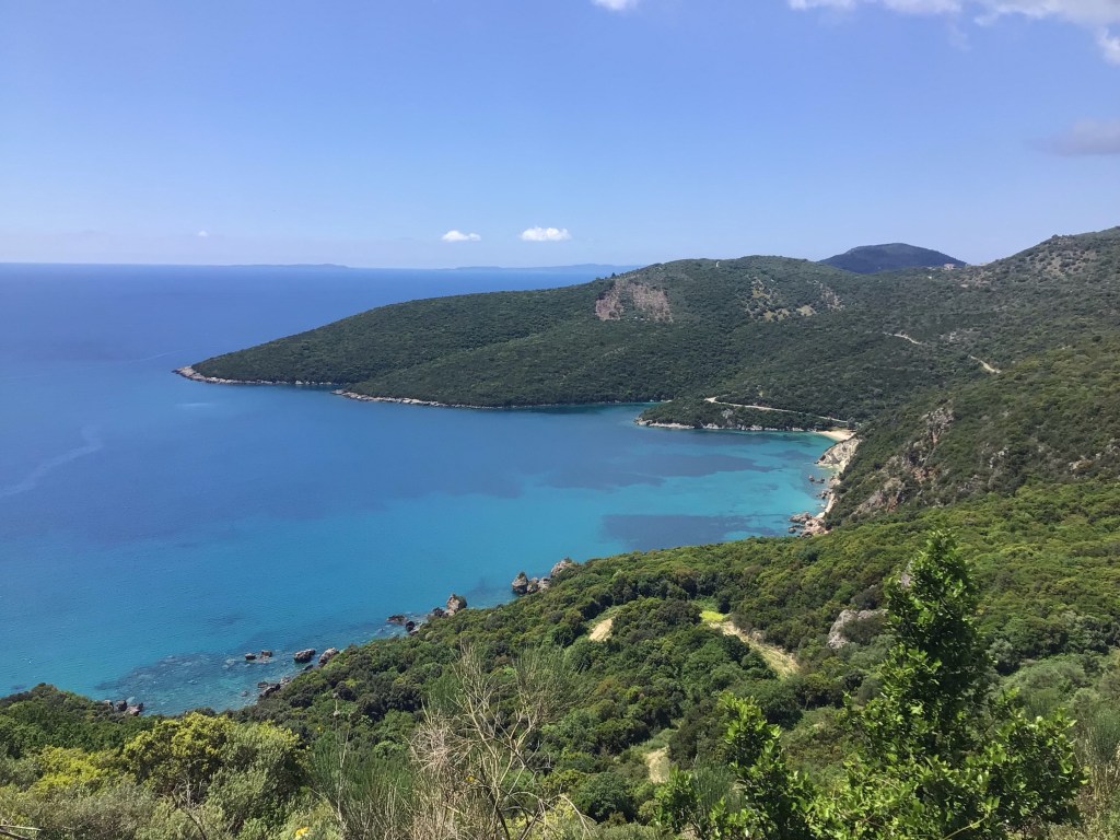 Réveillé après 8h. J’ai dormi comme un bébé. Aucun bruit. Aucun chien qui aboie. Aucun orage. Aucun rayon de soleil inquisiteur. Je déjeune à la terrasse de mon appartement. J’en profite pour nettoyer mon destrier avant de reprendre la route. Il est plus de 9 heures quand je prends la route 3202 (E55) qui longe la côte. Je quitte la baie d’Igoumenista.