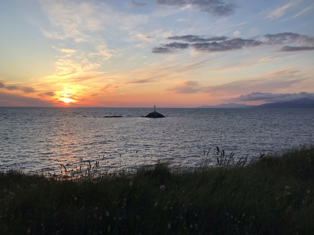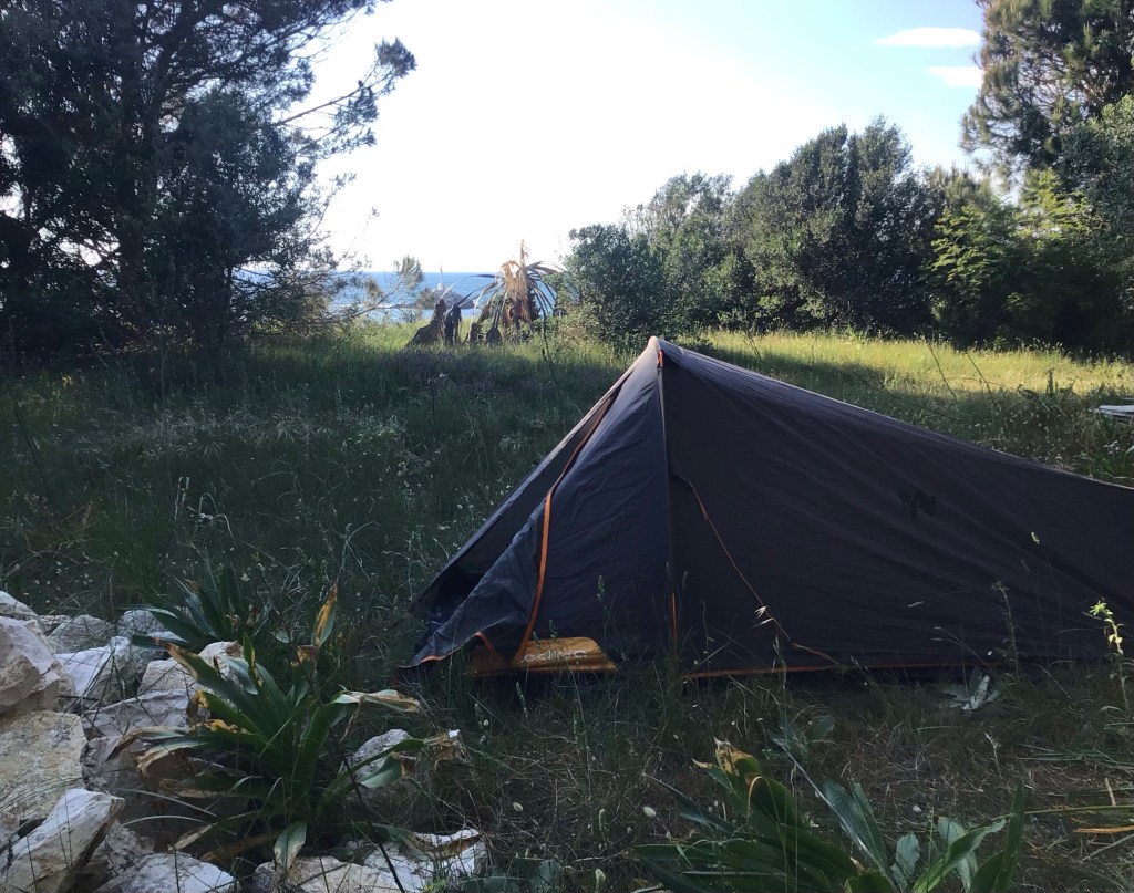 Je consulte mes cartes et repère un chemin côtier que j’emprunte. Je tombe sur un enclos ceint d’un grillage et d’un portail coulissant muni d’un cadenas. Je jette un œil. Le cadenas ne ferme que dalle. Je pousse le portail en disant : « Sésame ouvre-toi ! ». Et le portail s’ouvre. Je repère les lieux. C’est un petit dépôt de matériaux (briques, dalles, parpaings, …). Mais le top c’est que des arbres me protègent et du vent et des promeneurs. Ce sera parfait pour ce soir.