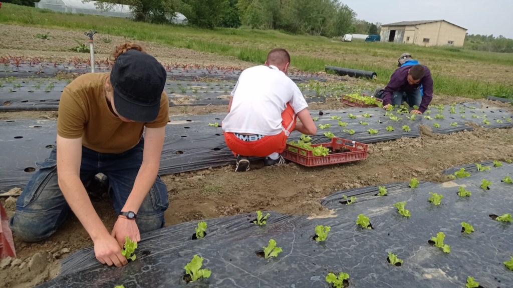 Une pensée aussi pour mes ami.es de L’Arche qui ont dû rentrer de leur séjour à Rome pour fêter les 25 ans de la Communauté. Seule une équipe réduite est restée pour assurer la continuité du maraîchage bio. Comme on ne reconnaît pas les personnes (mais moi je sais qui est qui), je me permets de publier cette photo. A ce sujet, vous remarquerez que c’est du fait-main. Alors oui, effectivement, c’est plus cher que le conventionnel. Mais, quand on est grassement payé, le cul posé devant un ordi au chaud tout l’hiver et au frais tout l’été, pour ne pas produire grand chose d’utile, on ne la ramène pas trop. Et je parle en connaissance de cause !