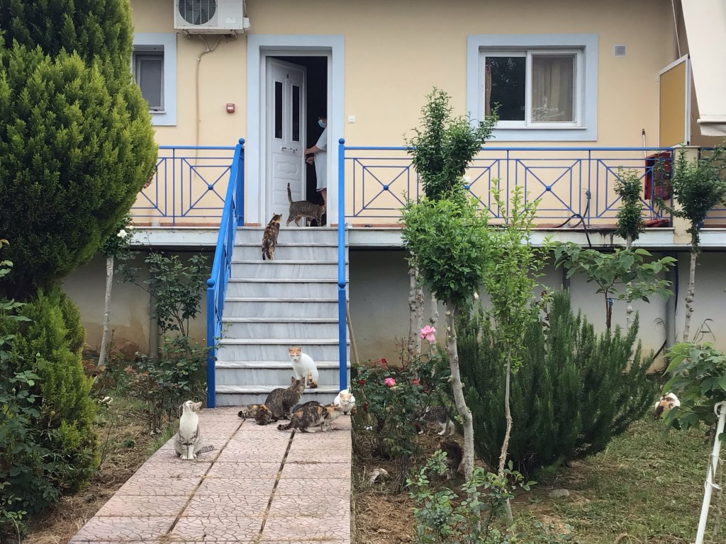 Comme chaque matin, le rituel s’instaure. Je déjeune assis sur un rocher qui est couvert de coquillages fossilisés. Et dire qu’il y a des millions d’année, je me serais retrouvé à déjeuner sous la mer ! Alors que je quitte cet endroit paradisiaque, je me trouve coincé par le portail qui a été verrouillé (et pour de vrai, cette fois-ci). J’avise une femme en tenue légère en train de nourrir une armée de chats. Je lui fais comprendre que j’aimerais bien reprendre ma route. Elle m’ouvre le portail et je quitte ce superbe endroit.