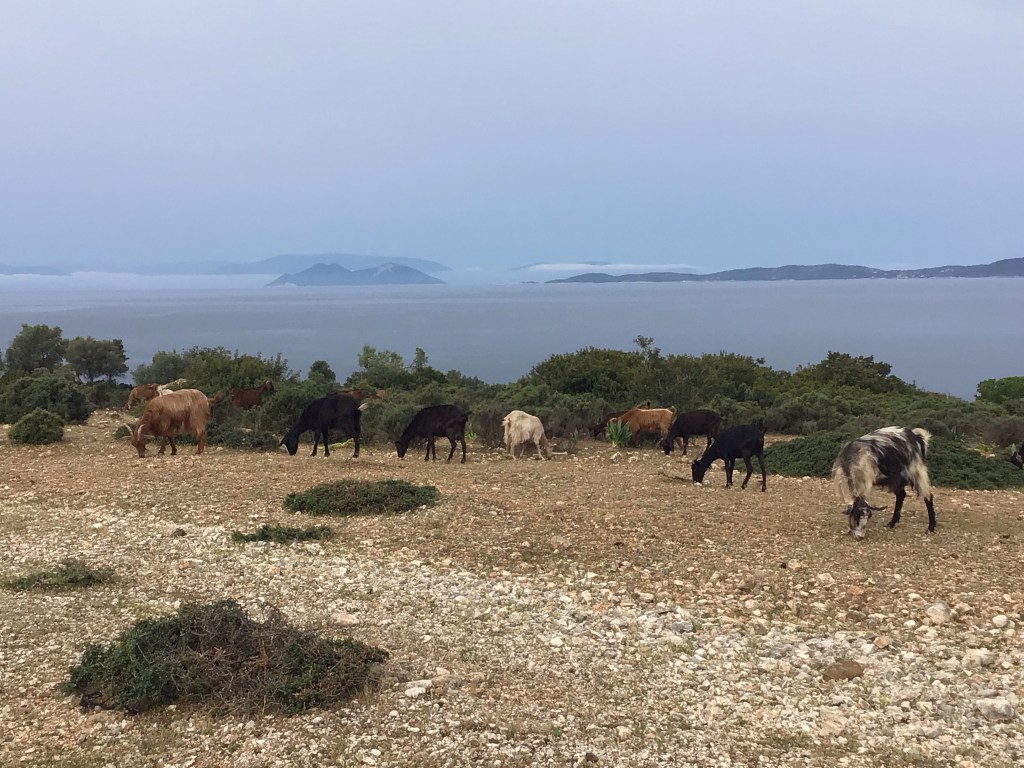 Le Roi Soleil a décidé de faire la grasse mat’ ce matin. La température est très agréable. Je suis protégé du vent. J’avance dans ce silence et ce cadre spectral. Seules, les clochettes des chèvres et des brebis en bord de route ou dans les montagnes ainsi que les camionnettes qui livrent les nombreuses fermes marines implantées sur cette côte.