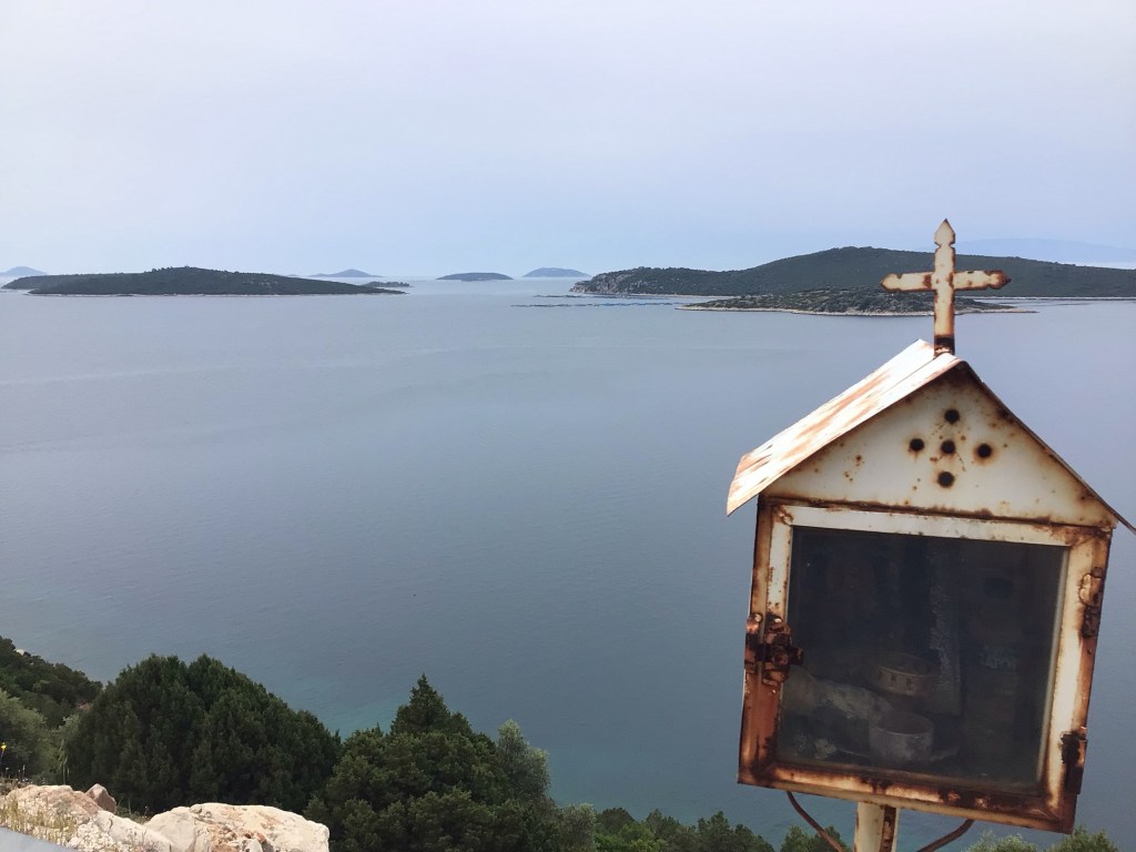 Je continue plein sud à l’abri du vent pour franchir ce cap avant de basculer vers Astakos. Je monte tranquillement à 8km/h en profitant de cette splendide vue sur ces îles avant de plonger à 50km/h dans les descentes. Lorsque je franchis ce cap, le paysage des îles changent. C’est dorénavant un chapelet d’îlets qui s’offrent à ma vue.