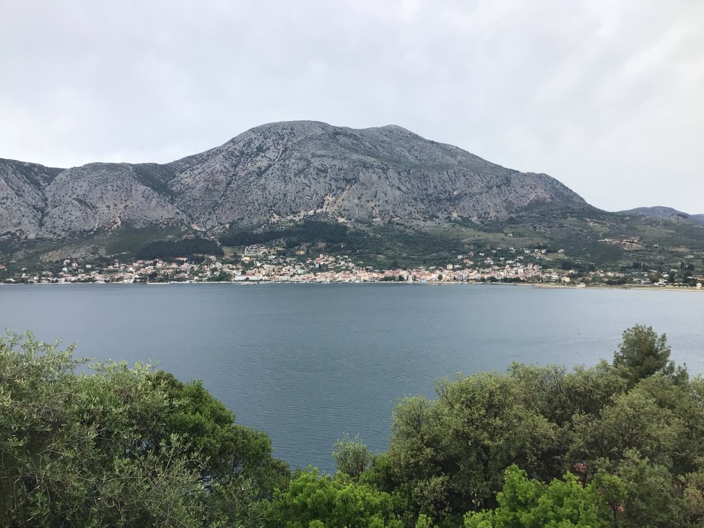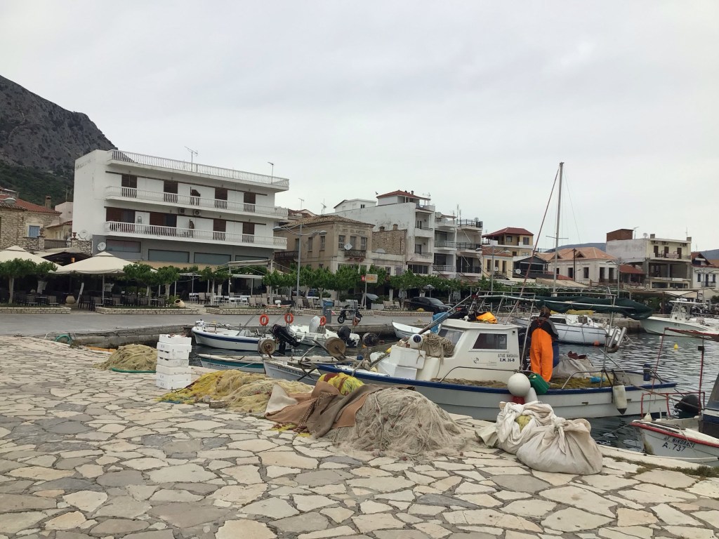 Vers 10h, j’arrive à Astakos en fond de baie où je m’arrête dans un super café pour ma pause matinale. Il y a déjà beaucoup de monde en terrasse et ça jacasse fort !
