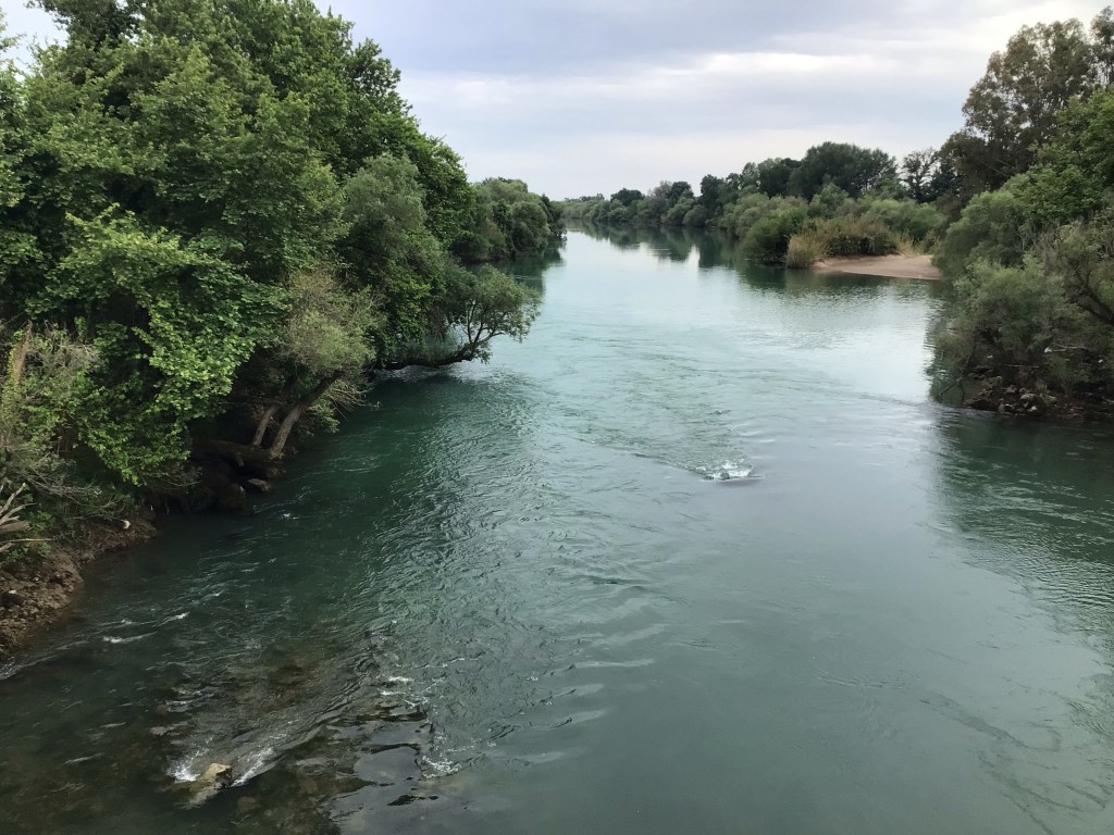 Je repars de cette baie et il me faut à nouveau grimper sur la colline pour en sortir. De majestueux vieux chênes verts me saluent au passage. Je plonge ensuite dans une large vallée céréalière, fruticole et viticole arrosée par l’Acheloos. Je roule grosse plaque. Les conditions sont idéales. Ni vent, ni soleil, ni dénivelé. A 13h, je m’arrête déjeuner dans un restau ouvrier dans le village de Katochi. Au menu : salade grecque, bœuf en sauce servi avec riz et frites, bière et café pour 13,50€. Après ce repas et ce répit, je repars repu et reposé. Avec ça, je devrais tenir jusqu’à ce soir.