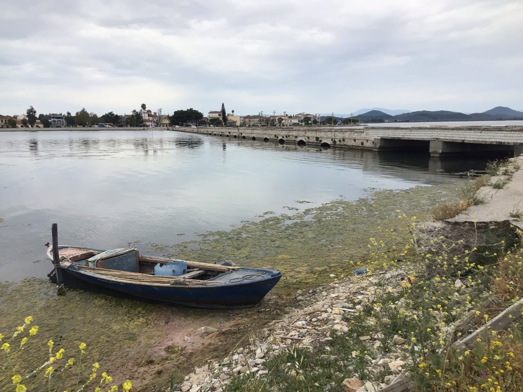 J’arrive à Etoliko, ville qui me semble très pauvre, où une immense lagune (c’est aussi un parc national) s’étend de part en part de ce pont. Par contre, à partir d’ici, le vent se met à souffler très fort. Il vient de la mer et je l’ai en plein dans le pif. J’avance à 12 à 13km/h nez dans le guidon quand je vois un gars en Gravel me doubler en me saluant tout juste. Comme un couillon de cyclistes, j’accélère et lui chope la roue pour m’abriter du vent. Je lui fais un petit signe alors qu’il regarde dans son rétro. Cela n’a pas l’air de lui plaire vu que, à peine une borne plus loin, il met le clignotant et s’arrête. Mauvais joueur !