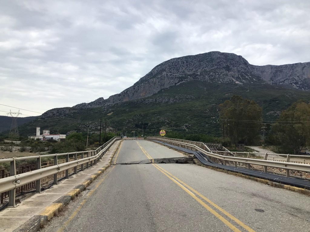 Je file ainsi dans la plaine jusqu’à Mesolongi toujours avec ce maudit vent. La route E05 est parallèle à l’autoroute A5 qui attire la majorité du flux routier. La route devient beaucoup plus tranquille. J’arrive à l’entrée d’Evinochori par cette route pour continuer en direction d’Antirio. Mais juste avant le pont qui franchit le fleuve (à sec) Eymos, est posé un panneau « voie sans issue » ! Et, à l’entrée du pont, d’énormes blocs de béton en interdit l’accès. Je m’arrête pour consulter mes cartes alors que je vois un piéton sur ce pont. Si un piéton passe, un vélo passe aussi. Alors que j’allais franchir l’obstacle, deux gros 4*4 Range Rover se pointent. Ils sont immatriculés en France. Les passagers me voient. Je les salue habillé de mon maillot distinctif du Stade Toulousain. Pas un retour. Pas un regard. Ils ne me calculent pas du tout. « Allez vous faire foutre connards ! ». Moi je passe !