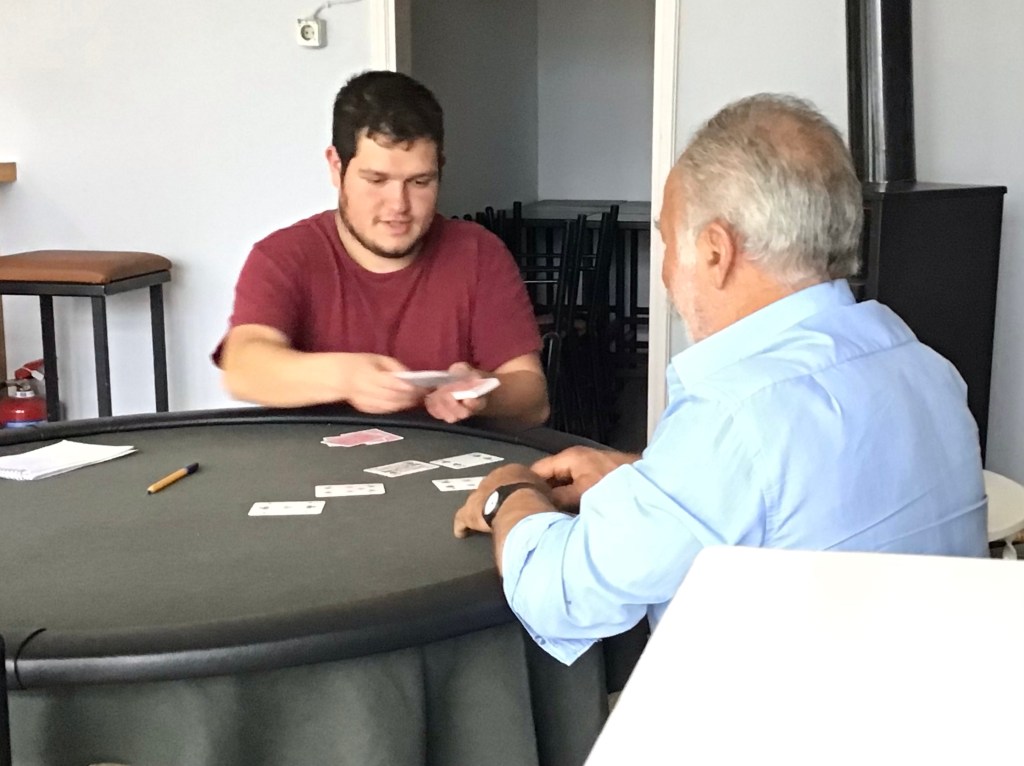 J’attaque à nouveau la montagne. Le vent se calme à l’abri de celle-ci. Je m’arrête dans un village pour téléphoner au fiston à Montréal pour mes problèmes de téléphonie. Il me confirme que ma carte SIM est périmée et qu’une nouvelle m’a été envoyée à mon appart. C’est malin. Je vais voir avec mon amie Jessy comment on procède pour que je puisse la récupérer au plus vite. Sans 4G, ce n’est pas toujours simple surtout s’il m’arrive un gros pépin. Je laisse le jeune patron et son vieil acolyte à leur jeu de cartes et je repars.