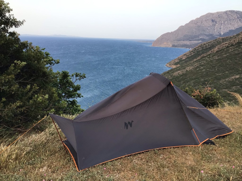 L’heure avance salement. La météo se gâte. Je suis encore à une dizaine de bornes d’Antirio. Je décide de m’arrêter le long d’un parking pour planter la tente. J’ai une vue exceptionnelle sur l’estuaire qui me sépare du Péloponnèse. Le temps de planter le bivouac, l’orage éclate ! Je me réfugie à l’abri. Ce soir, ce sera figues, gâteaux secs et chocolat au dîner. Bonne nuit les petits …