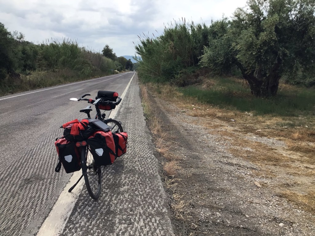 A Giannitsochori, je récupère la route E09 et je file bon train sur un bitume refait à neuf jusqu’à Kalo Nero. Au loin, j’aperçois les contreforts de la première pointe que je vais contourner demain. Il est 16h30, je n’ai pas trop envie de filer jusqu’à la prochaine ville Kyparissia. Je trouve un commerce ouvert et un bar en bordure de plage pour me désaltérer.