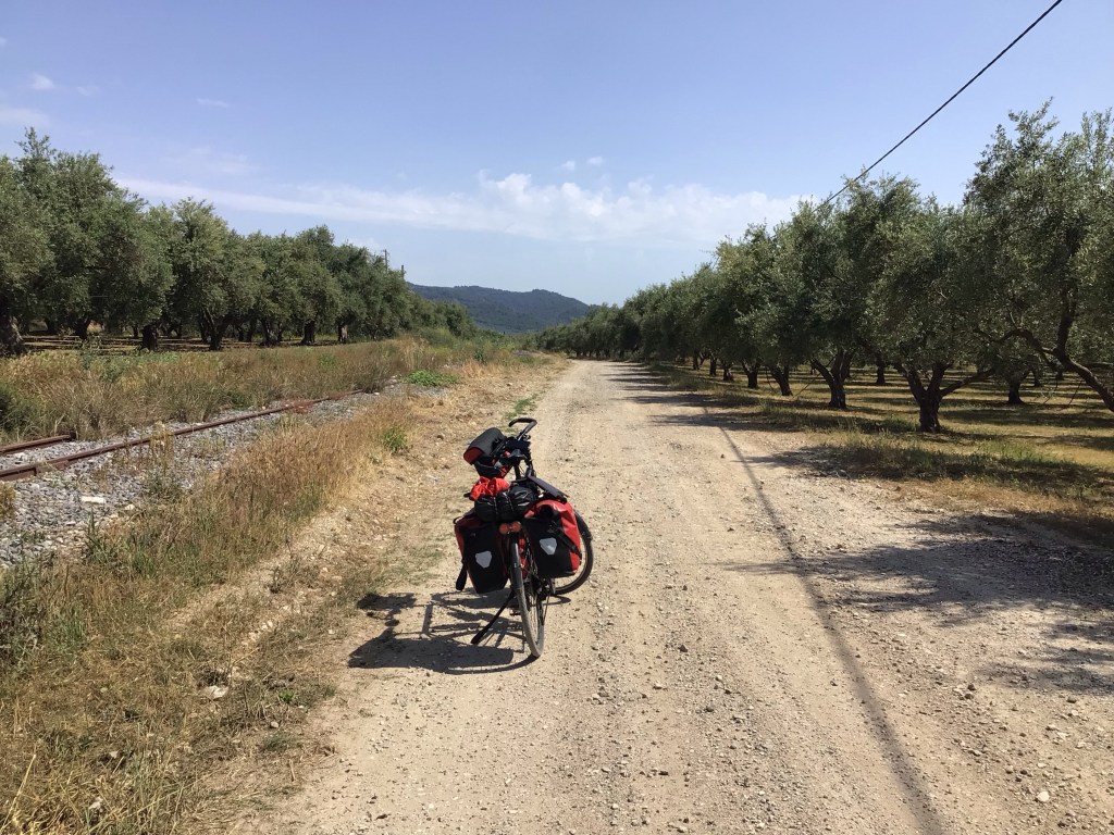 Durant ce temps, ma tente et ma bâche vélo ont séché. Je plie le tout et repars sur les petites routes de la campagne grecque. Ce matin, je vais suivre la côte avant de rejoindre Pyrgos. C’est calme en ce dimanche matin. Je quitte la pointe de Katakolo (j’adore) avec son ferry qui dessert d’autres îles ioniennes au large.