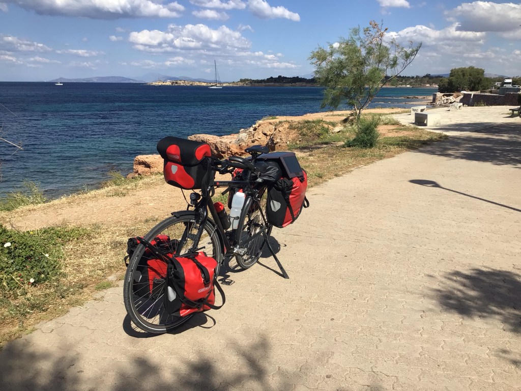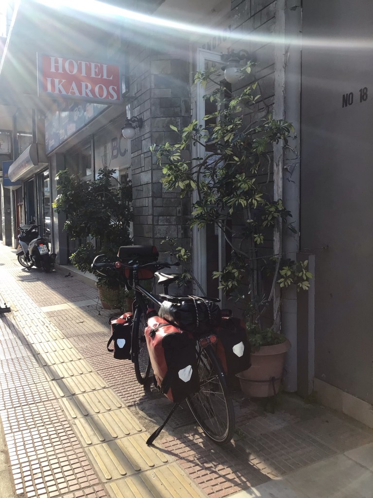 Finalement, malgré la position centrale de cet hôtel à quelques encablures des quais et le manque de double-vitrage, je n’ai pas trop mal dormi. J’ai juste eu un problème avec ma prise pour recharger tous mes appareils (iTrucs, auditifs, batteries, pace-makers, …). L’hôtel est tellement vétuste que les 3 prises dans la chambre étaient branlantes. A 8h30, je descends mes sacoches du 2nd floor, récupère mon vélo dans le cagibi, recharge le tout et pars en direction du Cap Sounion sous les rayons de soleil.