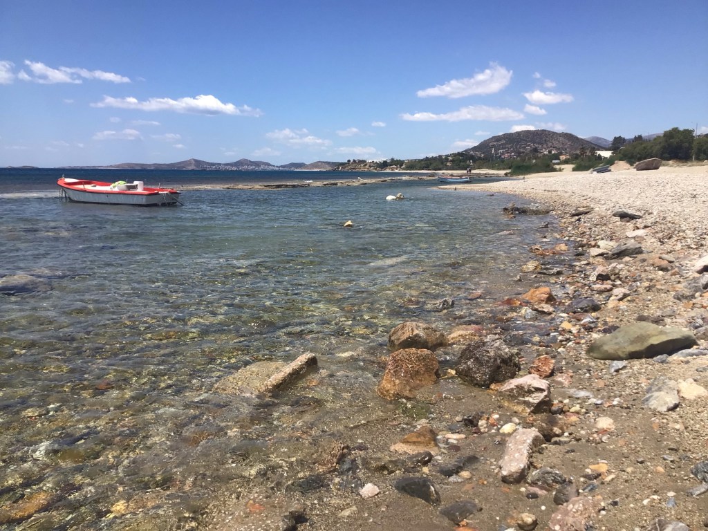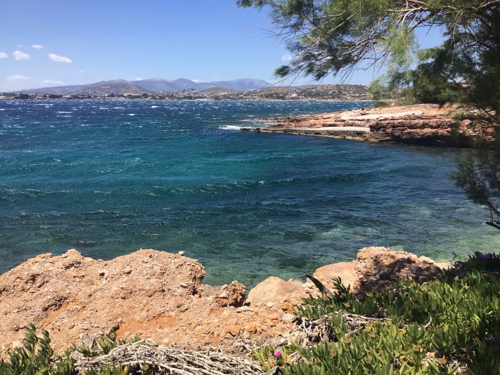 Je finis par arriver dans la banlieue chic à Glyfada où la circulation commence à se calmer puis je rejoins enfin le bord de mer. Je me pose à Vouglameni pour reprendre mes esprits et un café frappé. Mon allo Loïc m’appelle juste à ce moment. On papote un moment. Cela fait du bien de baragouiner français.