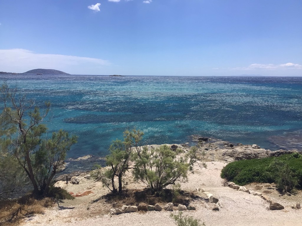 Après m’être baigné sur ma plage privée, je me rince et passe à l’apéro (bière grecque Fix et cacahuètes) en tapotant sur le clavier. Petite anecdote au sujet des Cyclades. Lorsque j’étais revenu pour la 3è fois en Grèce, j’avais vadrouillé à travers les îles les plus connues. De mémoire : Mykonos, Paros, Santorini, … Et aussi une toute petite île dont les cinéphiles devraient se souvenir. Et, pendant que je raconte tout cela, quelques voiliers et ferries, faisant la navette avec les îles de Makronisos et Kythnos, rentrent au port de Lavrion.