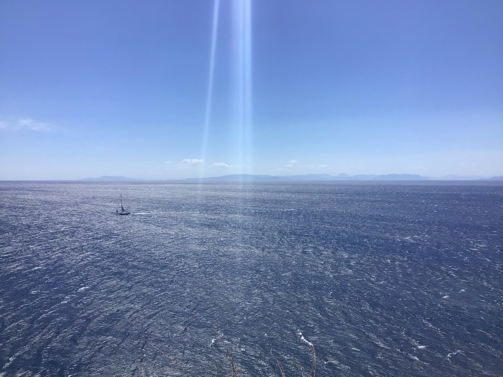 Je m’arrête boire mon café grec pour me secouer un peu la paillasse à Palea Fokea. A partir de ce village, la route se rétrécit et passe à une voie. Ça commence aussi à grimper au fur et à mesure que je me rapproche de la pointe. Au loin, j’aperçois quelques îles des Cyclades les plus proches du continent (Kéa, Kythnos, Sifnos) alors qu’un voilier remonte le vent au moteur (petit joueur).