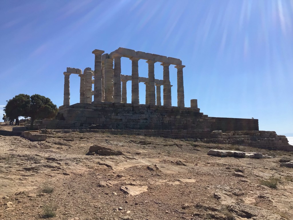Après une belle grimpette face au vent, j’arrive enfin au Cap Sounion et à son fameux temple dédié à Poséïdon (comme chacun sait, le Dieu de la Mer chez les Grecs). En principe, il faut y aller au coucher du soleil. C’est ce que j’avais fait lors de mon 2nd voyage en Grèce. Là, je paie mon entrée et fais le tour avec les nombreux touristes débarqués en bus climatisé. Dont des français qui ne me calculent pas du tout !
