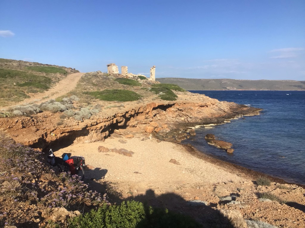 Il ne me reste plus qu’à redescendre, m’arrêter au premier village sur la côte est pour y faire mes courses pour la soirée et trouver un bivouac. A Kato Posidonia, je bifurque sur la droite après avoir repéré un château sur une pointe. Je galère pas mal pour y accéder à travers de mauvais chemins et des lotissements de petites maisons de vacances. Une fois sur place, il s’avère que le château est plutôt mal en point. De plus, le vent souffle fort sur cette pointe. Cela s’annonce mal. Je vais pour repartir quand je repère une crique juste en-dessous à l’abri du vent. Une petite niche sur la plage. Parfait. Je me pose en face l’île allongée de Makronisos.