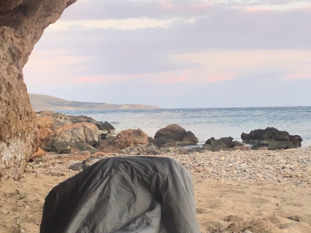 40è jour de mon périple. Réveillé aux aurores après une bonne nuit sous mon rocher comme si vous y étiez … avec mes doigts de pied en éventail sous mon duvet !