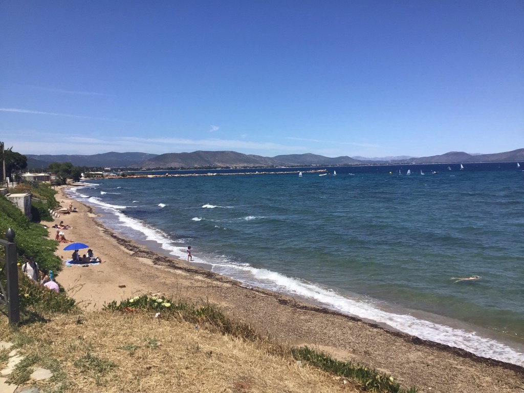 Puis je repars en suivant la côte et ses nombreuses plages. A Rafina, je traverse un camp immense où chaque arme a son propre espace clôturé (interdit de prendre photos, films, …) avec strictement les mêmes bungalows. Impressionnant et flippant. Je préfère la plage et la mer même si longer toutes ces plages, tavernas, cafés, … n’est vraiment pas ma tasse de thé. Vous l’aurez compris !