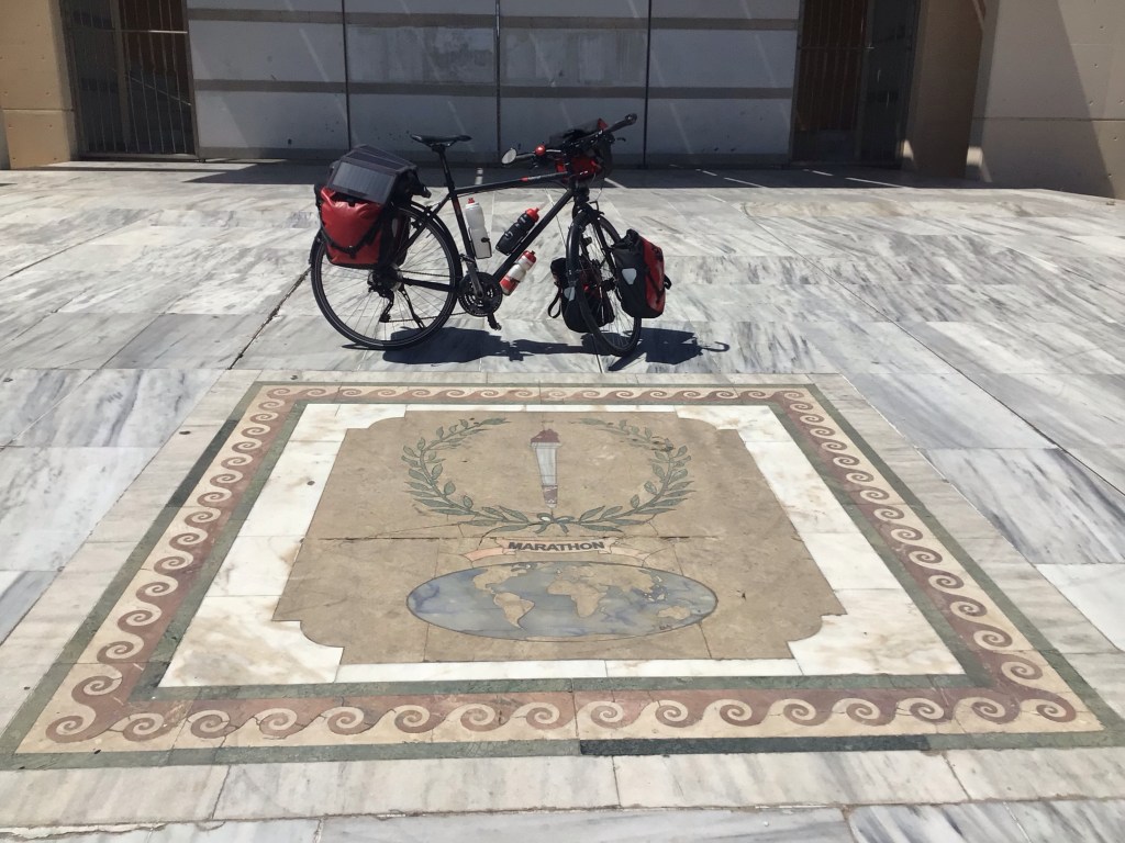 Je me dirige ensuite vers Marathon pour y faire un pèlerinage forcément. Je me répète : compteur bloqué à 34. Le village en lui-même n’a rien de folichon. Le musée du marathon m’a l’air définitivement fermé. Et je ne trouve pas le Trophy Marathon en souvenir de la guerre et du fameux épisode avec Philippidés, hémérodrome (porteur de courrier) athénien, qui aurait parcouru la distance entre Marathon et Athènes (40kms) pour prévenir de la victoire lors de la 1ère guerre médique en 490 AV JC. Puis aurait annoncé la victoire « Nenikekamen ! » avant de mourir d’épuisement.