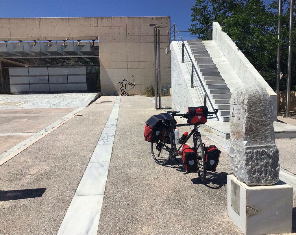 A Kouvaras, je mets le clignotant à gauche pour m’arrêter boire mon café frappé. Je m’arrête dans un bar qui s’appelle « Everbest49 », cela ne s’invente pas ! Je vais désormais prendre des petites routes pour passer au sud de l’aéroport d’Athènes, rejoindre le bord de mer et monter faire un pèlerinage à Marathon. Après avoir traversé des champs d’amandiers en fleurs, d’oliviers en pleurs, de figuiers à l’heure et de vignes en chœur, je rejoins la mer à Artemida, immense station balnéaire où les véliplanchistes et kite-surfers s’en donnent à cœur joie. Dommage qu’elle soit juste en bout des pistes de l’aéroport … On ne peut pas tout avoir !
